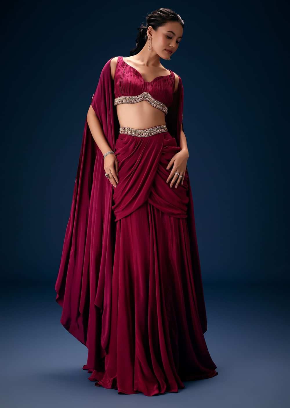 - Radiating regal charm this magenta ensemble pairs a handembroidered blouse with an attached cape and a draped fishcut skirt.