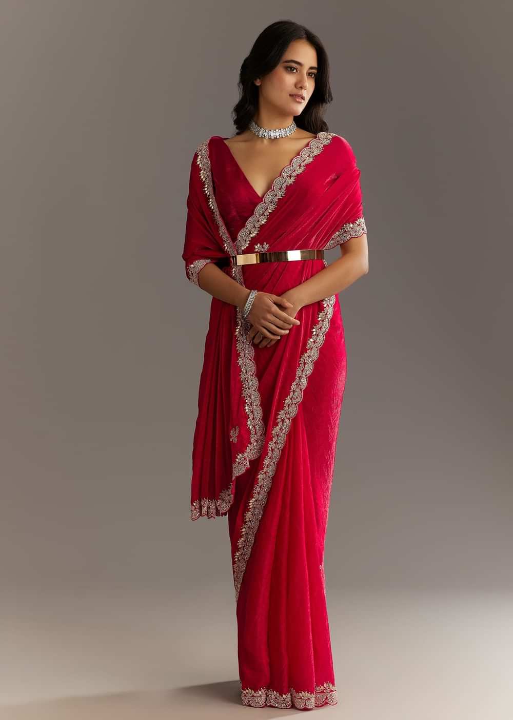Majestic and moody like a royal court affair this magenta satin saree is rich with gotapatti zardosi stones and cutdana—crafted for a midnight enchantress.Awarded as the Most Trusted Brand we're delivering styles you love just as promised.