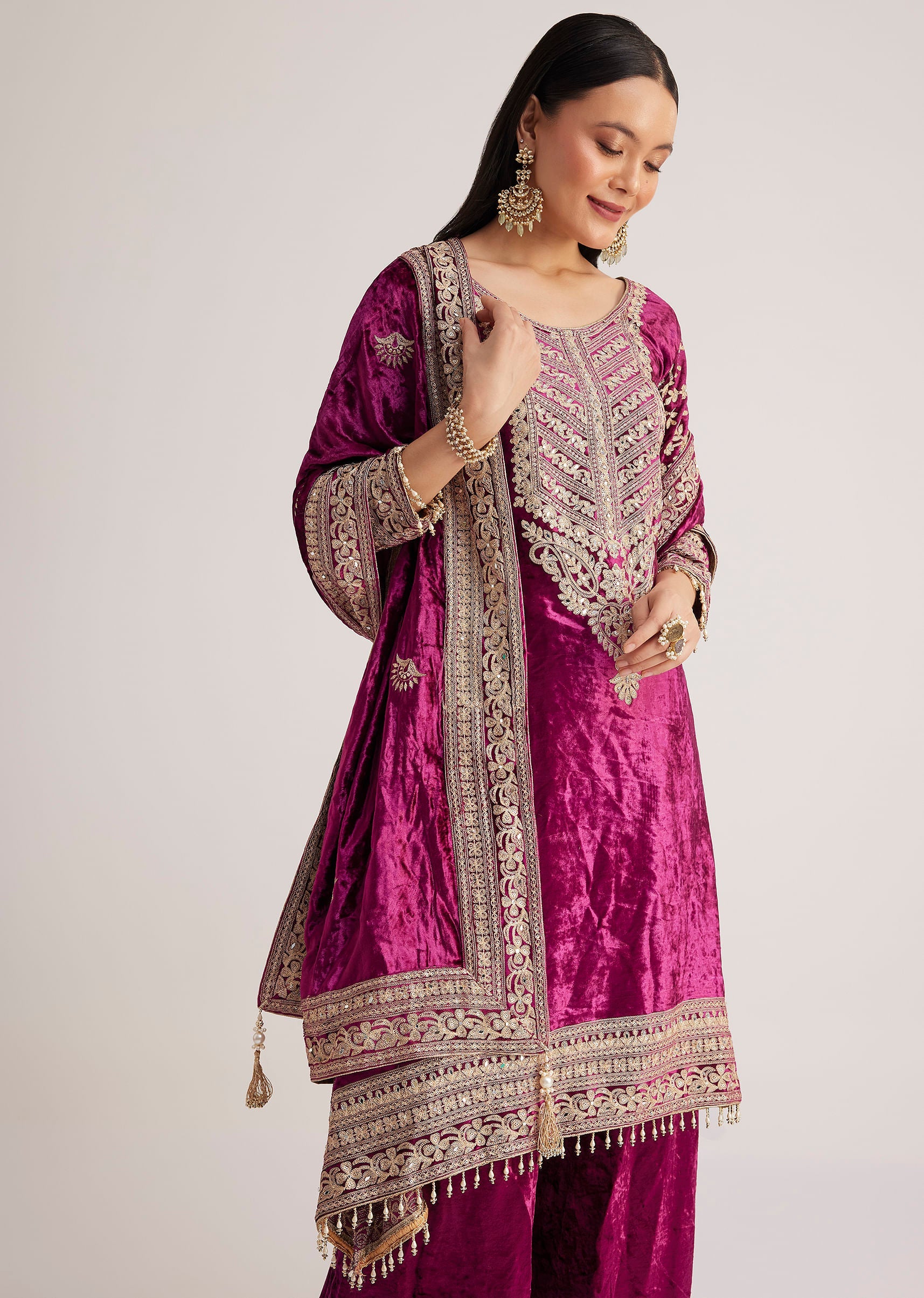 Turn Heads With This Luxurious Magenta Pink Velvet Palazzo Suit Designed To Bring A Royal Touch To Your Festive Wardrobe. Perfect For Wedding Functions Like Sangeet Or Reception Nights This... More Product Details