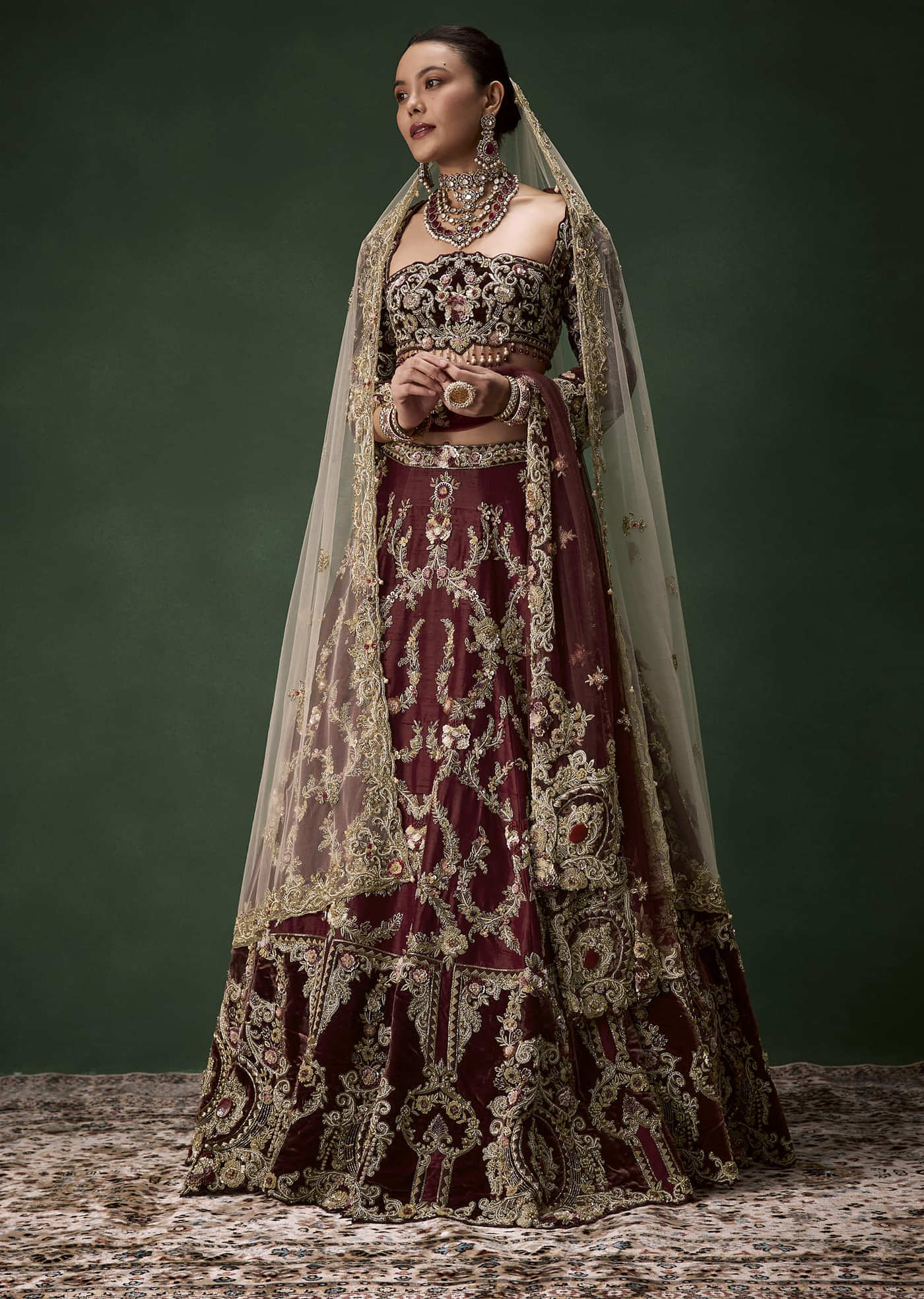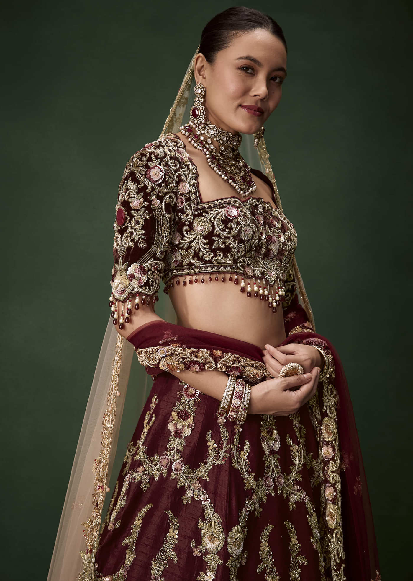 Maroon Bridal Silk Zardozi Lehenga Set with Two Dupattas