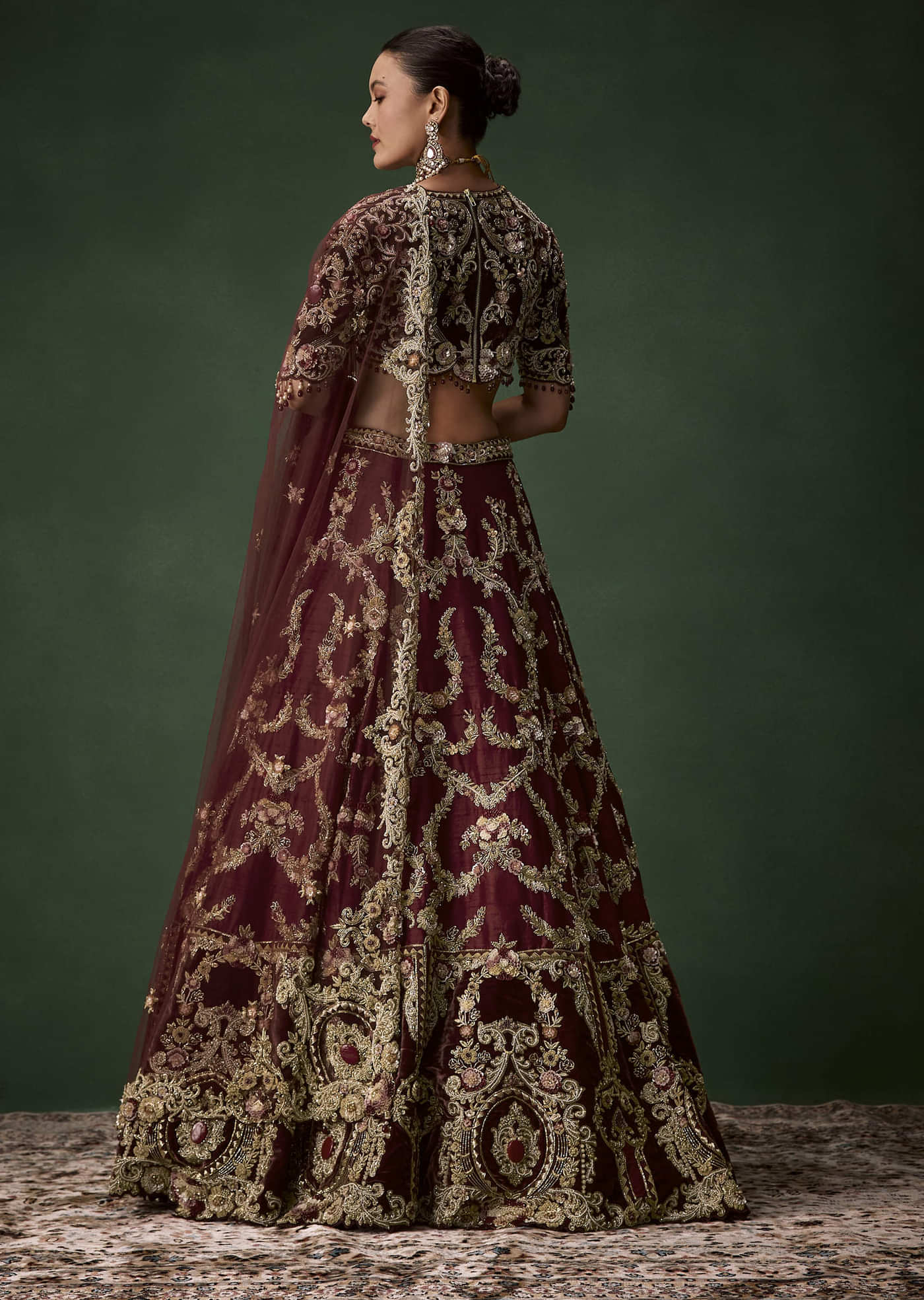 Steeped in regal allure, this maroon silk lehenga set celebrates traditional bridal opulence with a refined modern sensibility. The deep shade evokes timeless richness, while intricate zardozi, sequin, and cutdana... More Product Details