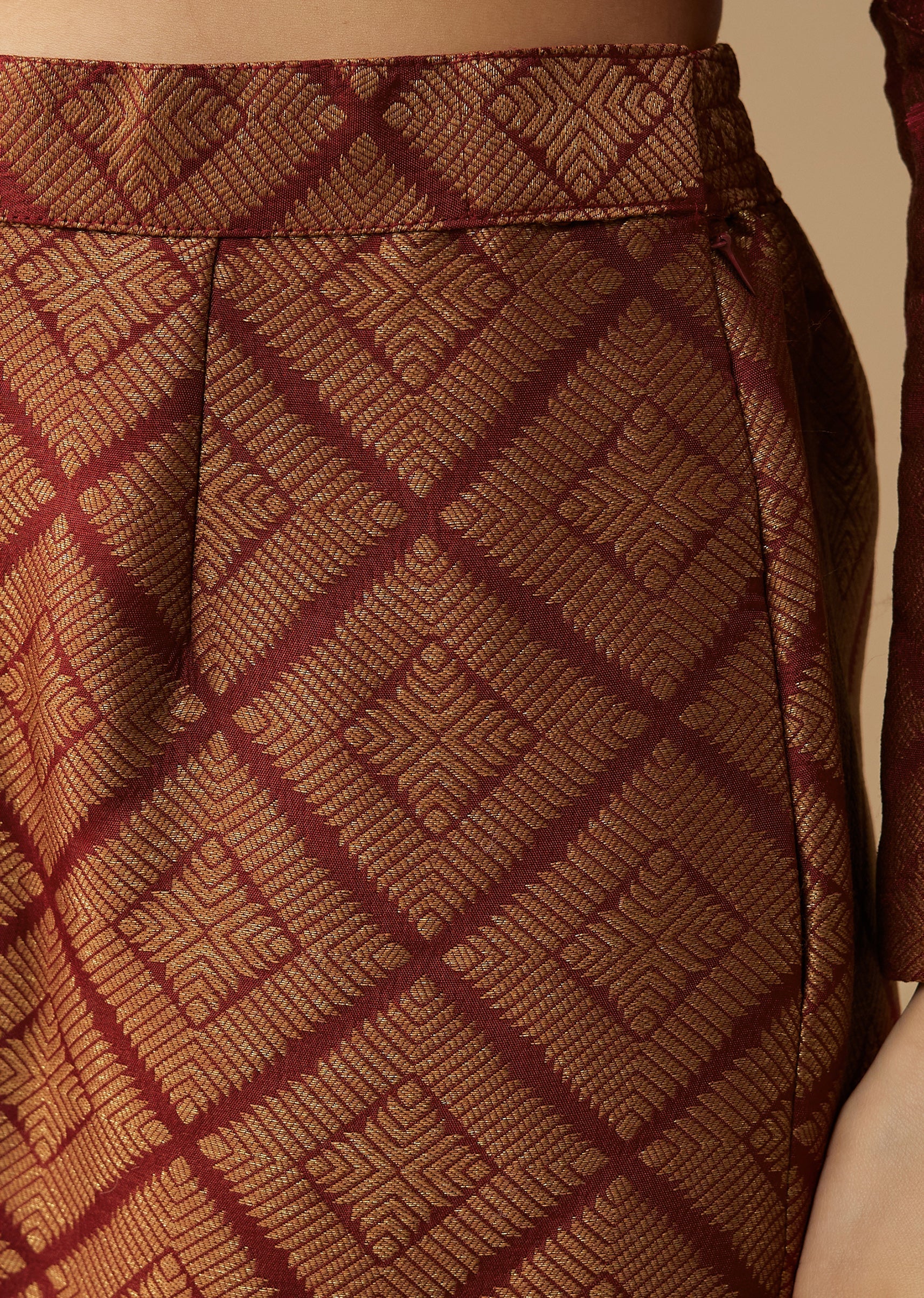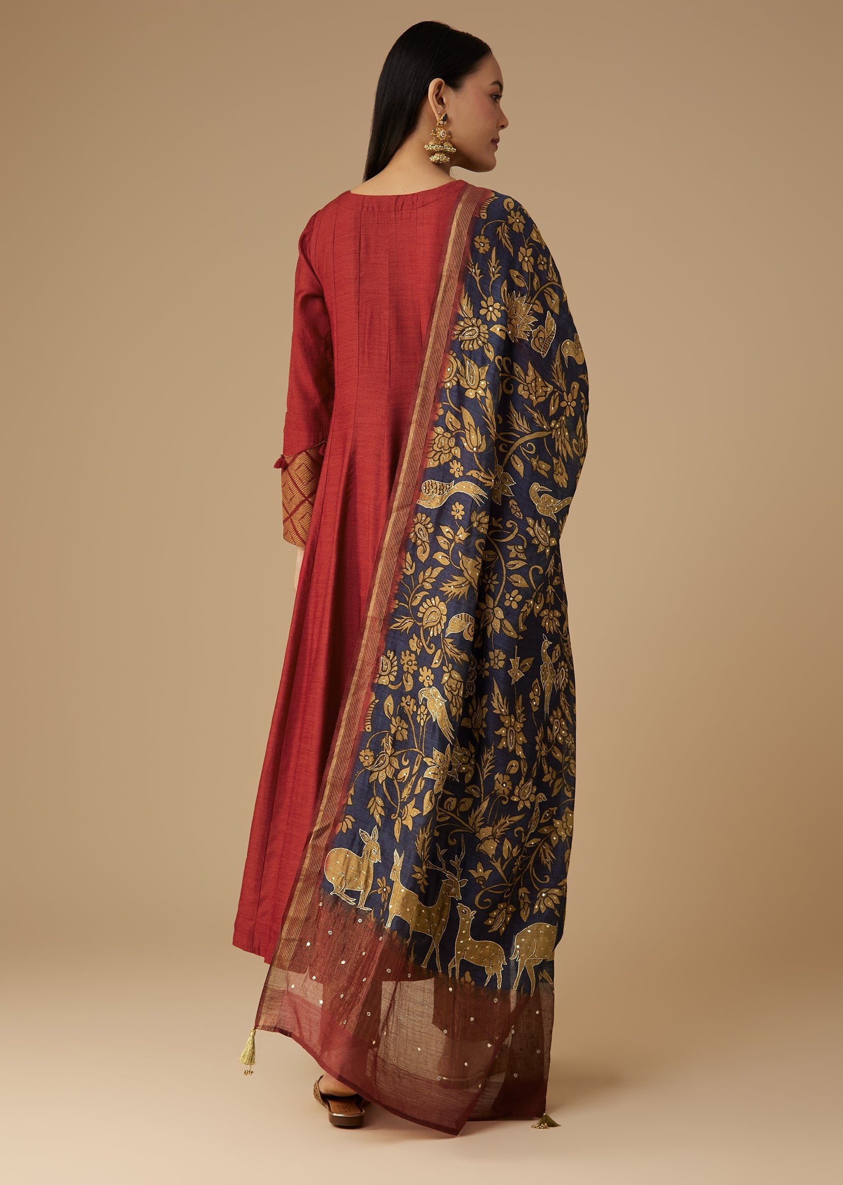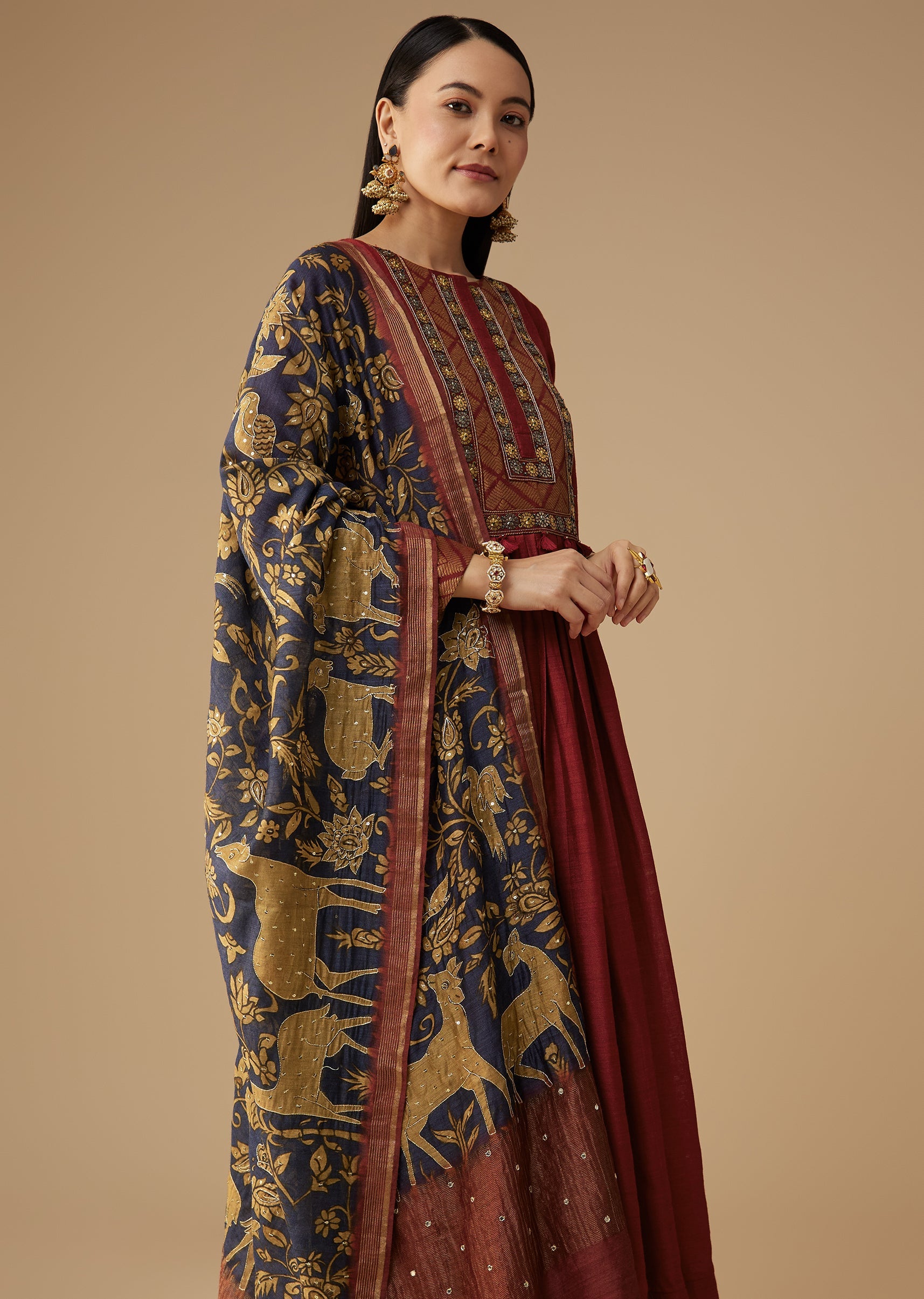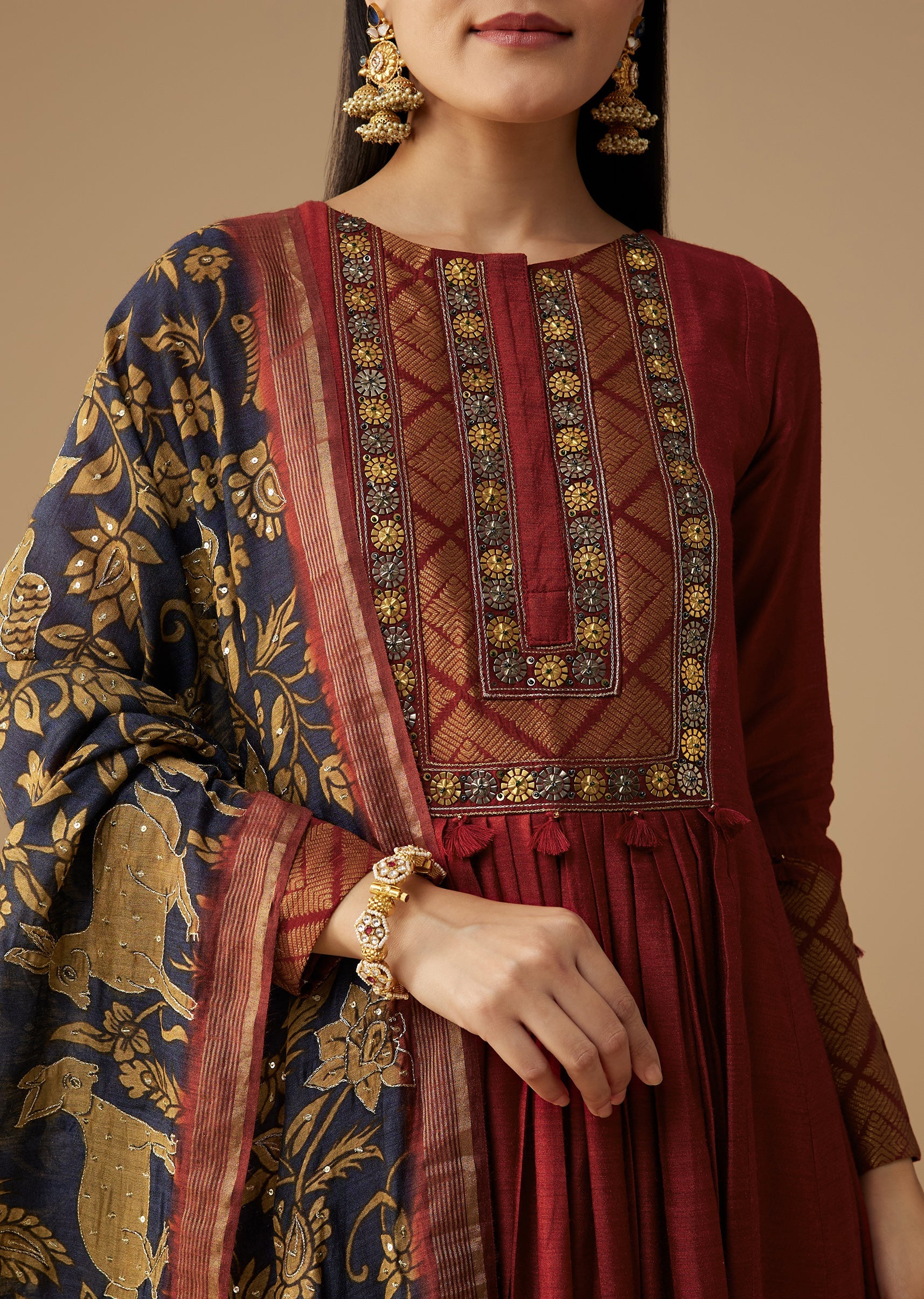 Indulge in rich traditional elegance with this maroon anarkali set, featuring a brocade yoke and sleeves that bring depth, texture, and regal charm. The full brocade pants add a luxurious... More Product Details