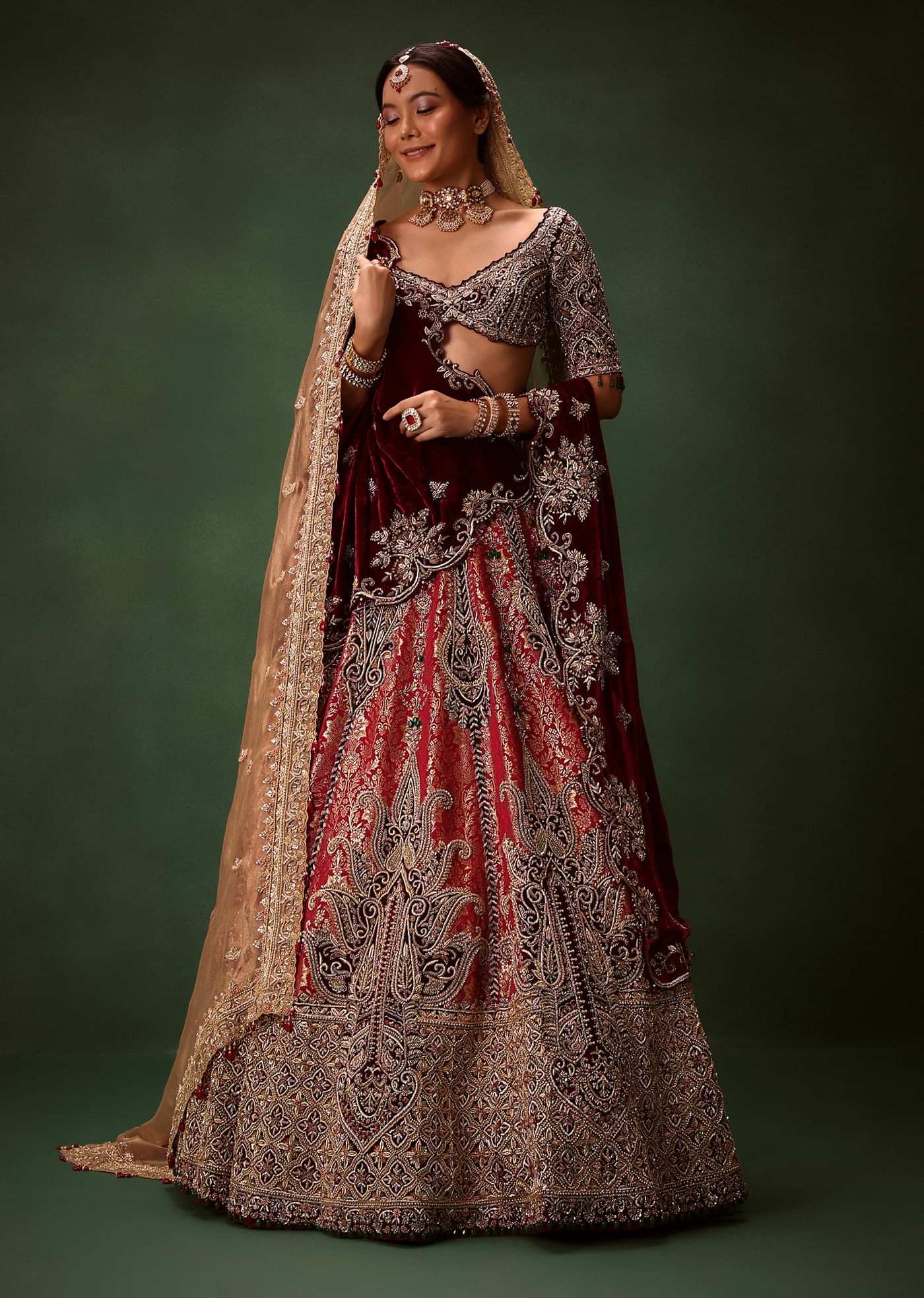 Maroon Brocade Lehenga Dupatta With Cross Body Blouse