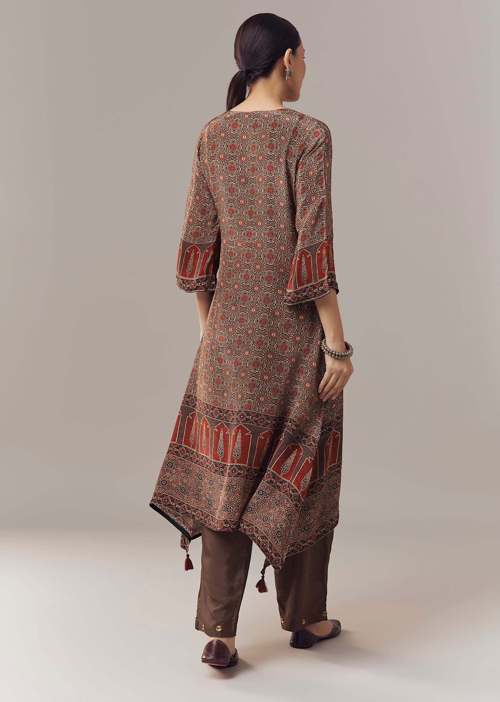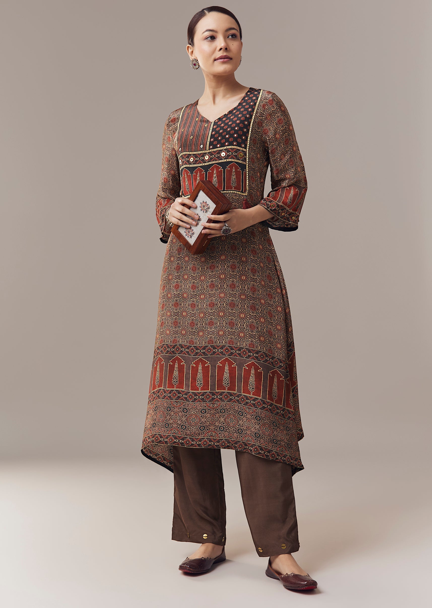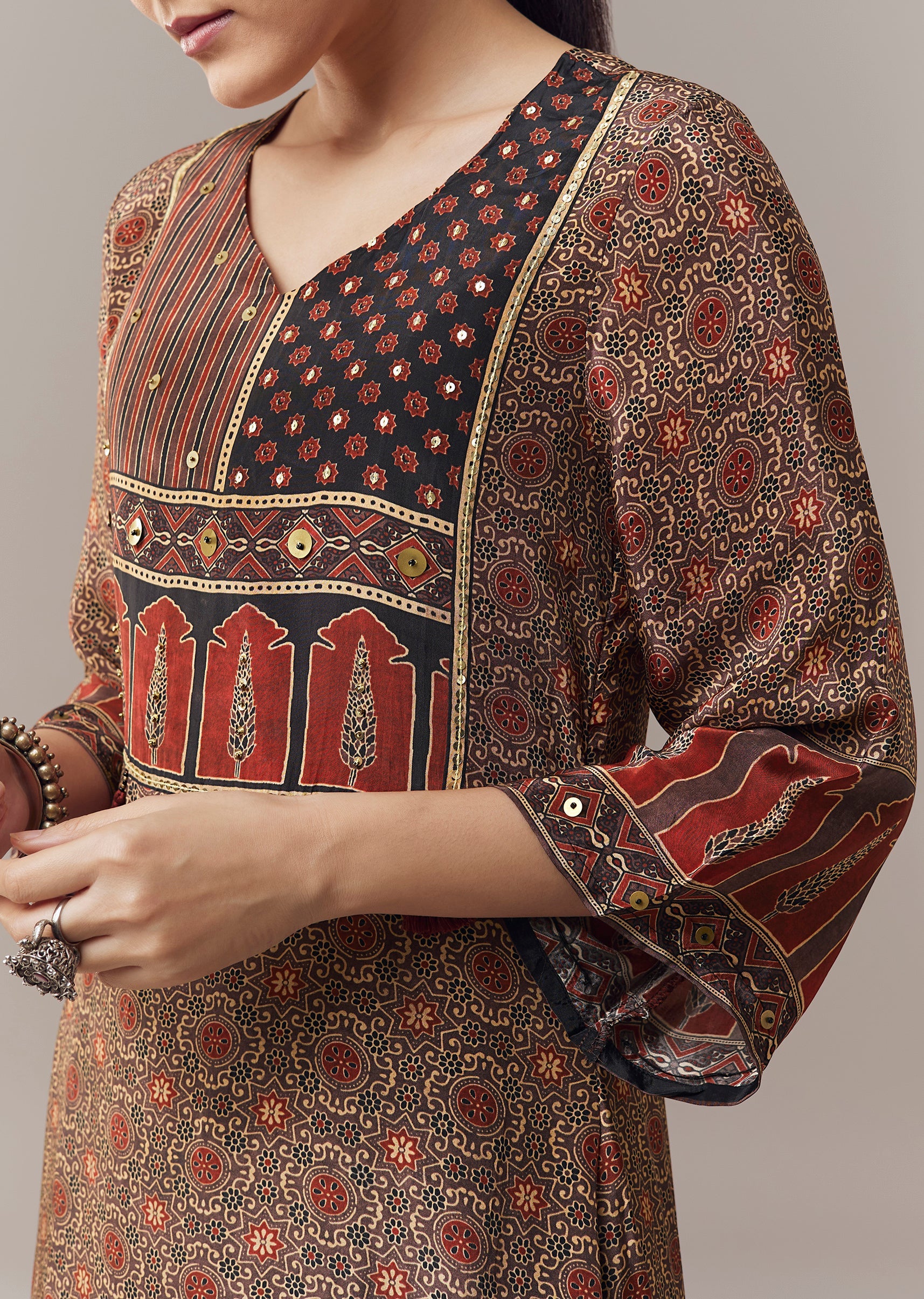 Pair it with neutral juttis and minimal jewellery to let the sequins detailing and Ajrakh print stand out.
