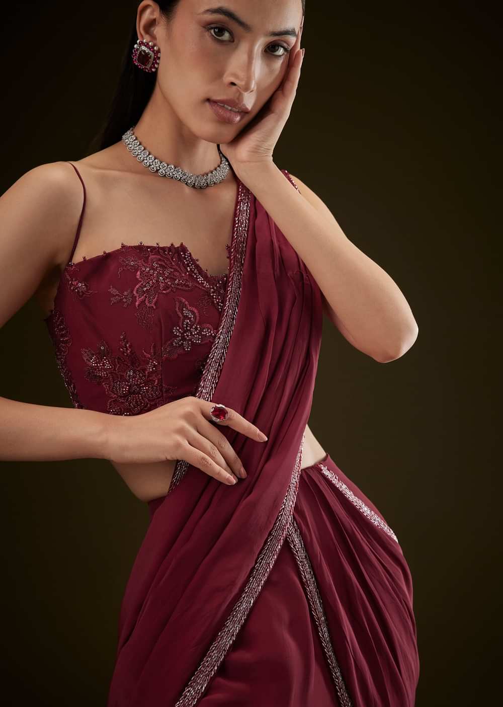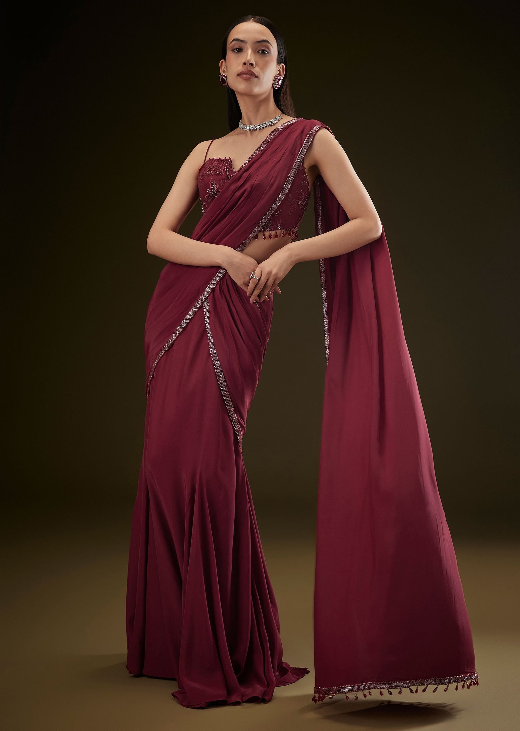 Envelop Yourself In Timeless Elegance With This Maroon Prestitched Draped Saree A Vision Of Modern Grace Fused With Tradition. The Fluid Crepe Fabric Cascades Effortlessly While Intricate Handembroidery Embellishments Of Cutdana And Beads Shimmer With Every Movement. A Sculpted Corset Blouse Adorned With Delicate Embroidery And Tassel Details Adds A Touch Of Romance To The Ensemble. Perfect For Cocktail Soirées Receptions And Festive Celebrations This Outfit Is Crafted To Make A Statement Of Effortless Sophistication.Awarded As The Most Trusted Brand We'Re Delivering Styles You Love Just As Promised.