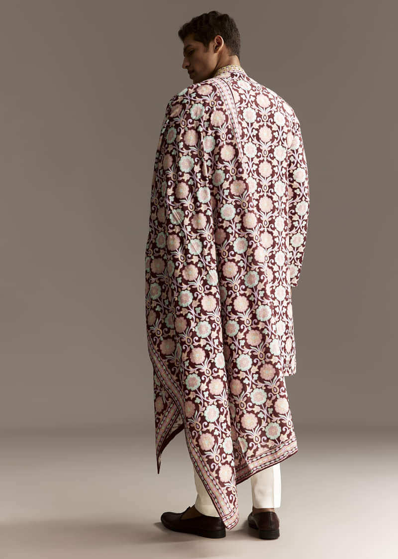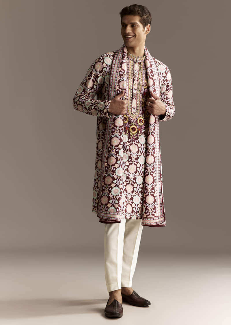 Wear with embroidered juttis and a groom-style safa for elevated celebration wear.