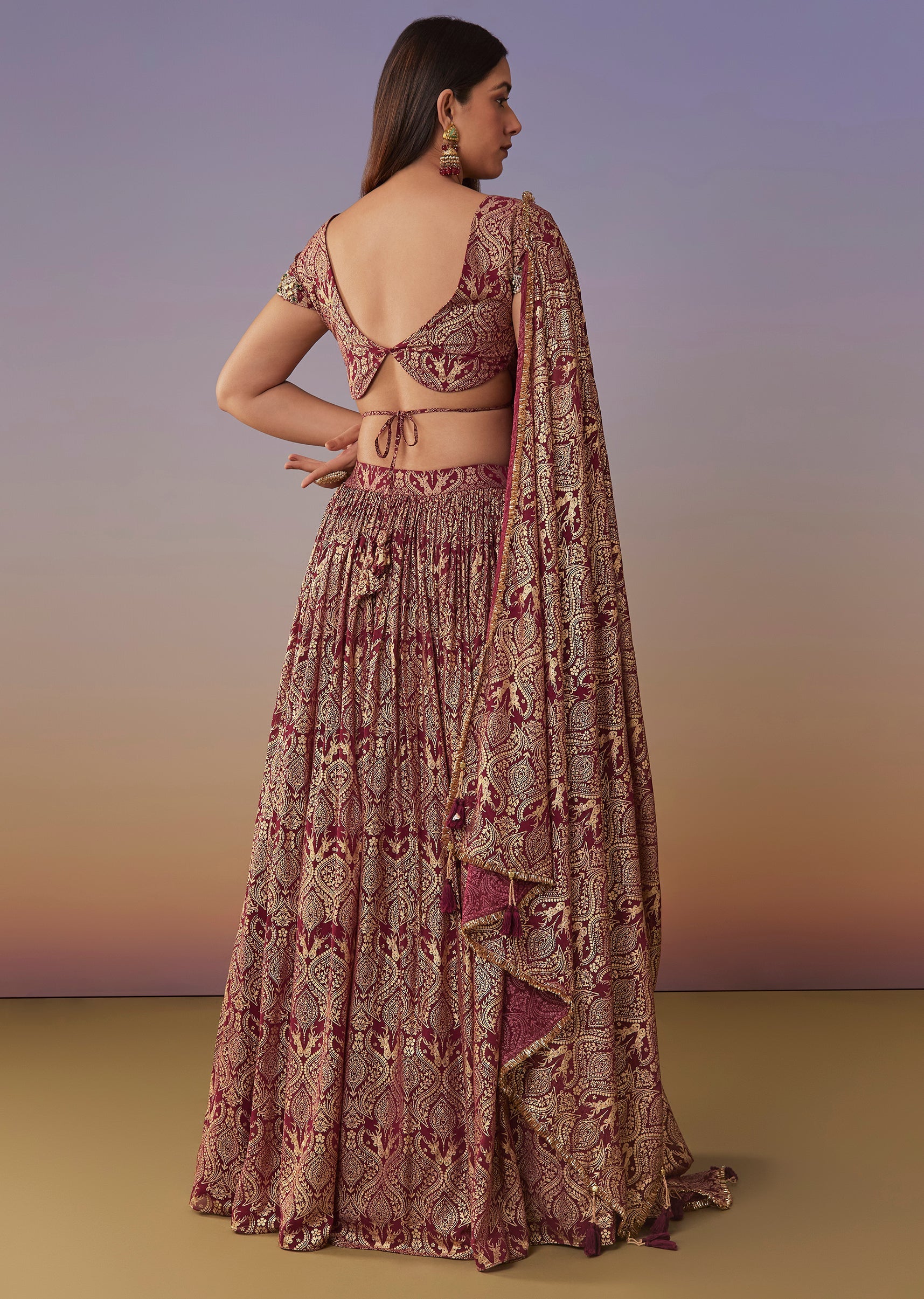 Maroon Foil Printed Lehenga Set With Subtle Embellished Detailing