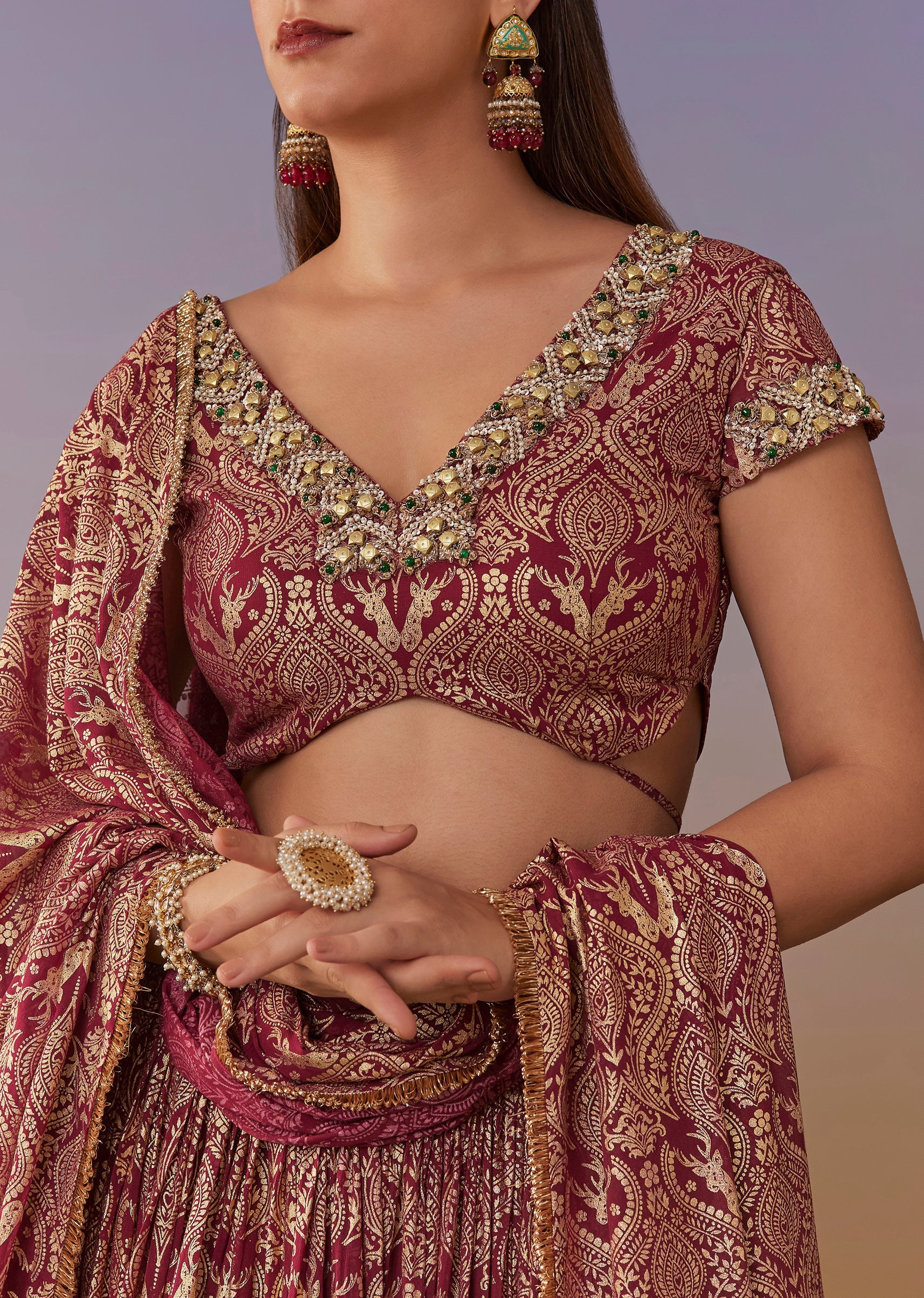 A festive maroon lehenga set in georgette featuring a foil indie print, paired with a half-sleeve V-neck choli and matching dupatta. Finished with embroidery and bead-stone accents, it’s an easy... More Product Details