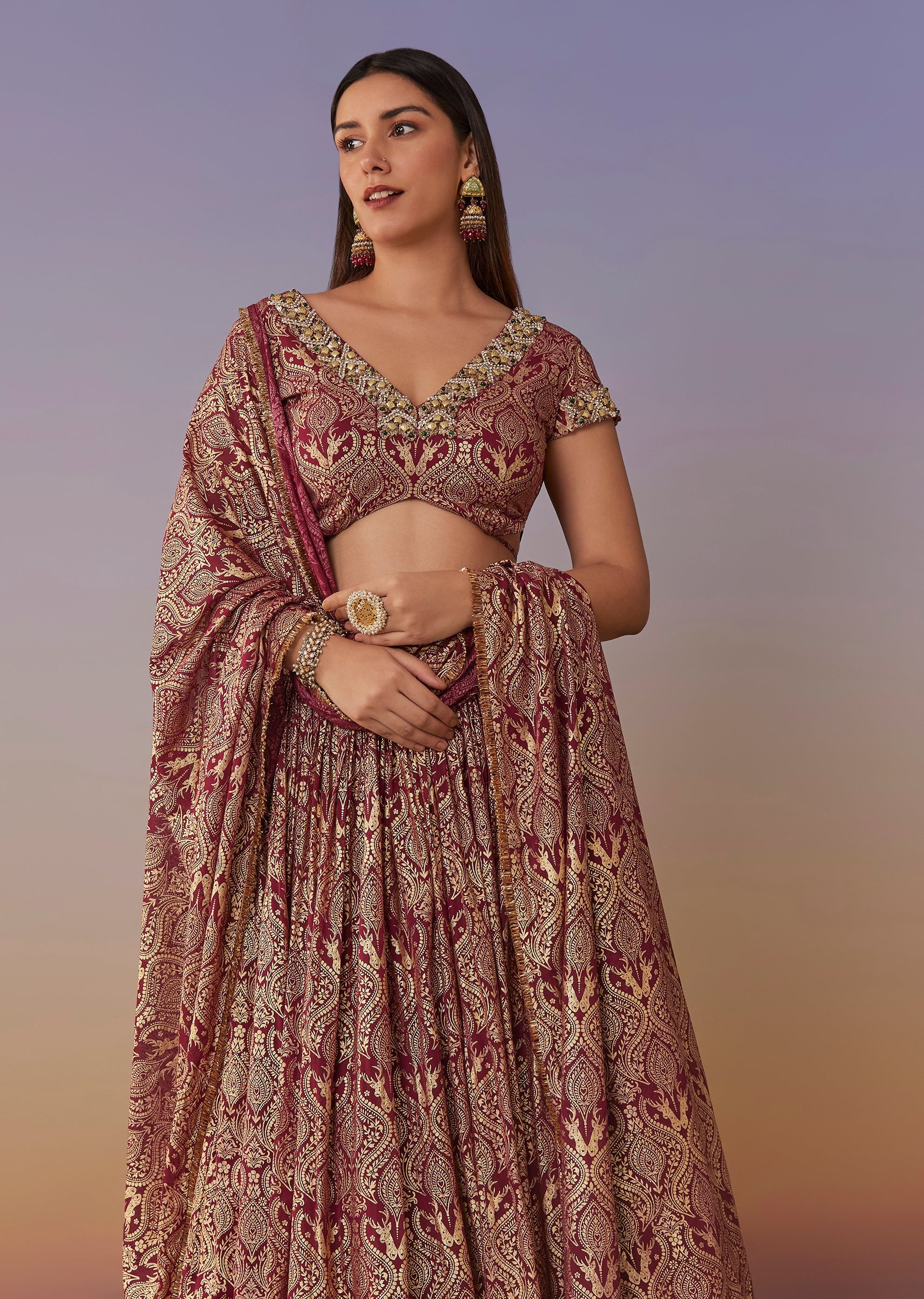 A festive maroon lehenga set in georgette featuring a foil indie print, paired with a half-sleeve V-neck choli and matching dupatta. Finished with embroidery and bead-stone accents, it’s an easy bridesmaid pick with a modern festive shine. Awarded as the Most Trusted Brand, we're delivering styles you love, just as promised.