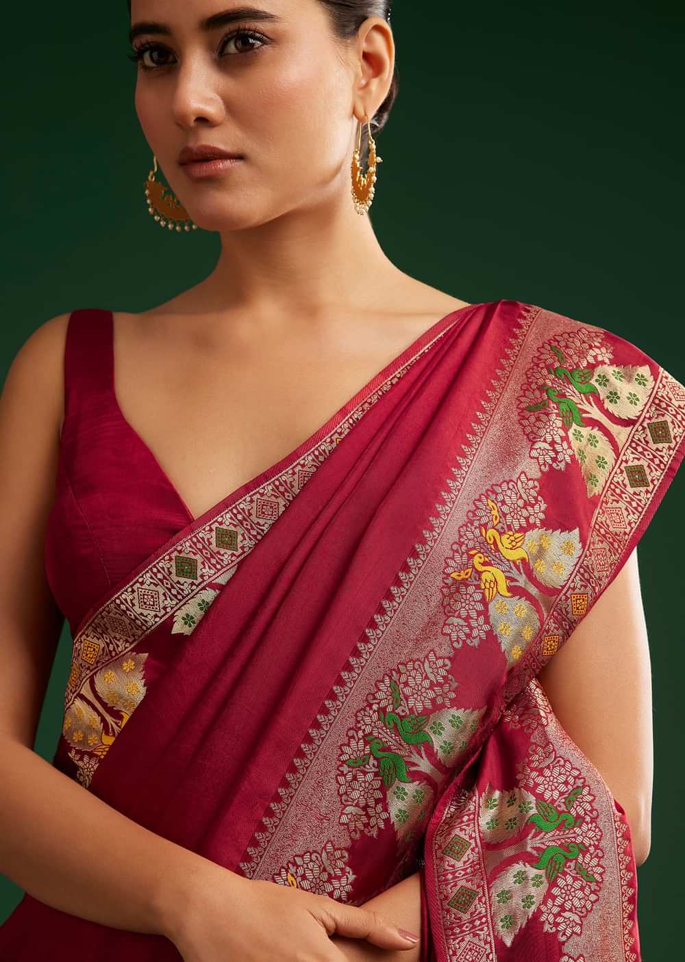 Showcasing a harmonious blend of tradition and modernity, this maroon georgette saree is woven with intricate zari and accented with multi-color threads. Its unique design is perfect for festive occasions and celebratory events. Awarded as the Most Trusted Brand, we're delivering styles you love, just as promised.