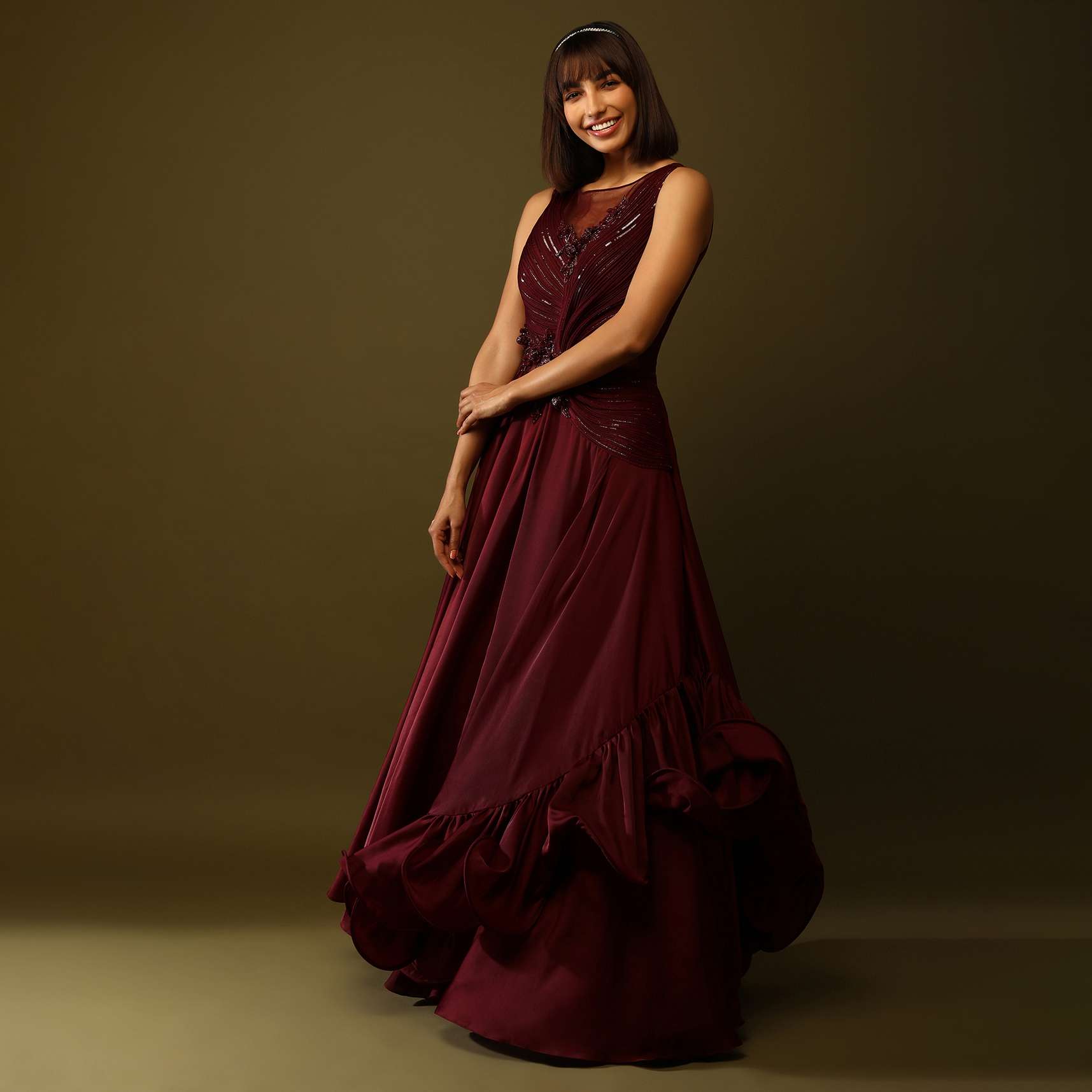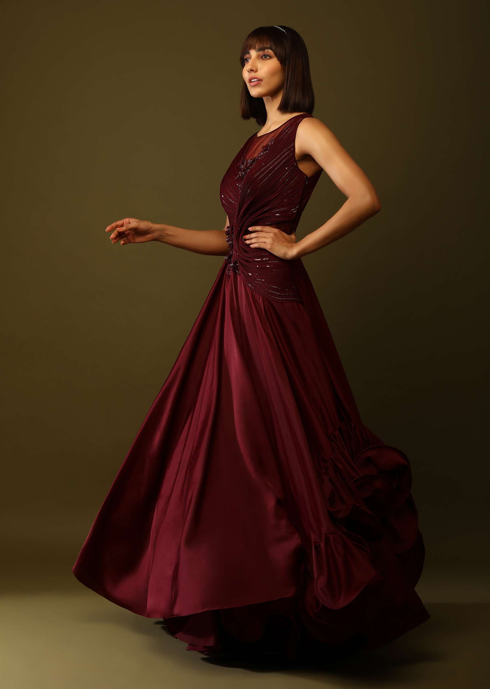 Maroon Gown With Ruched Bodice And Fancy Ruffled Hem