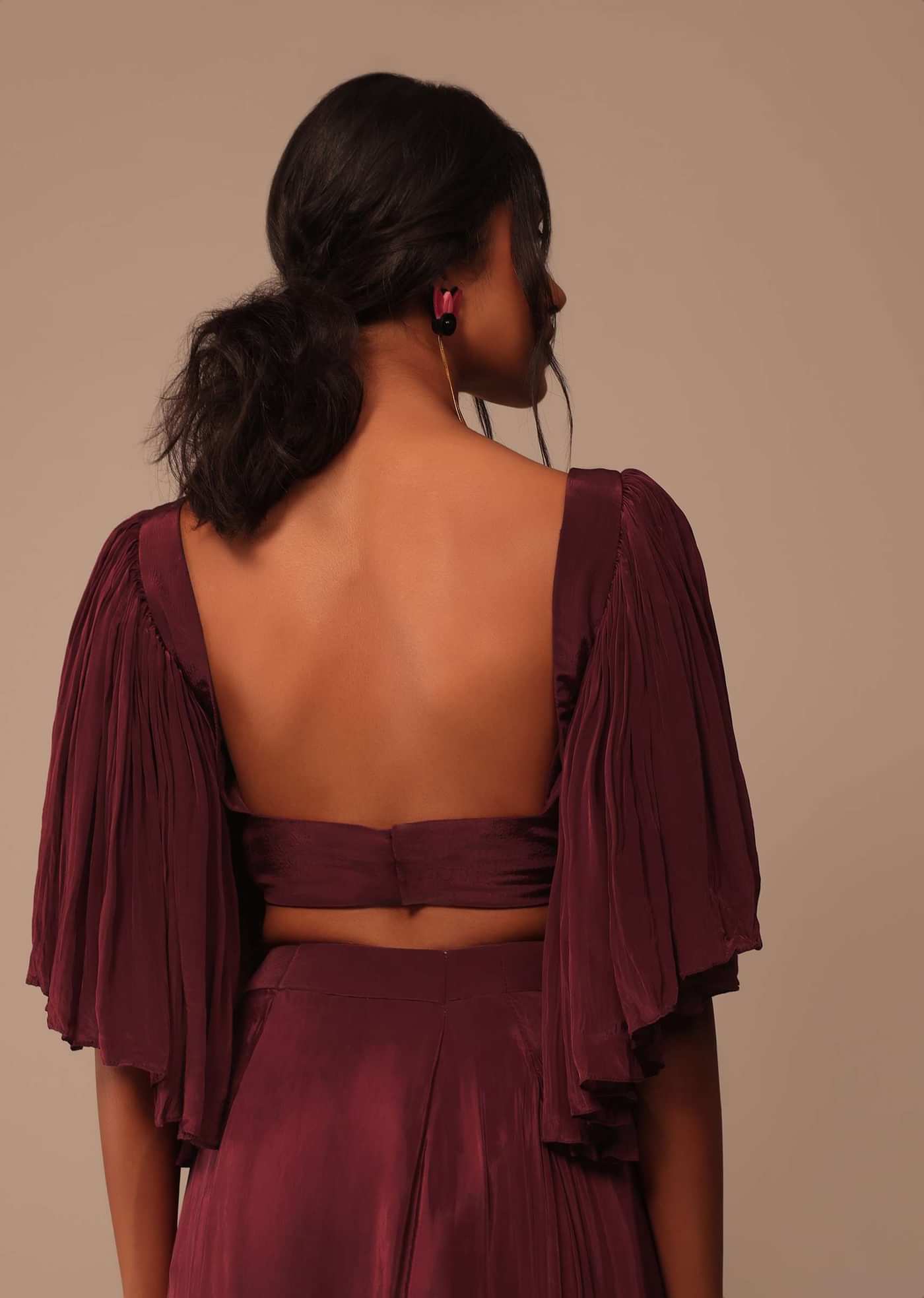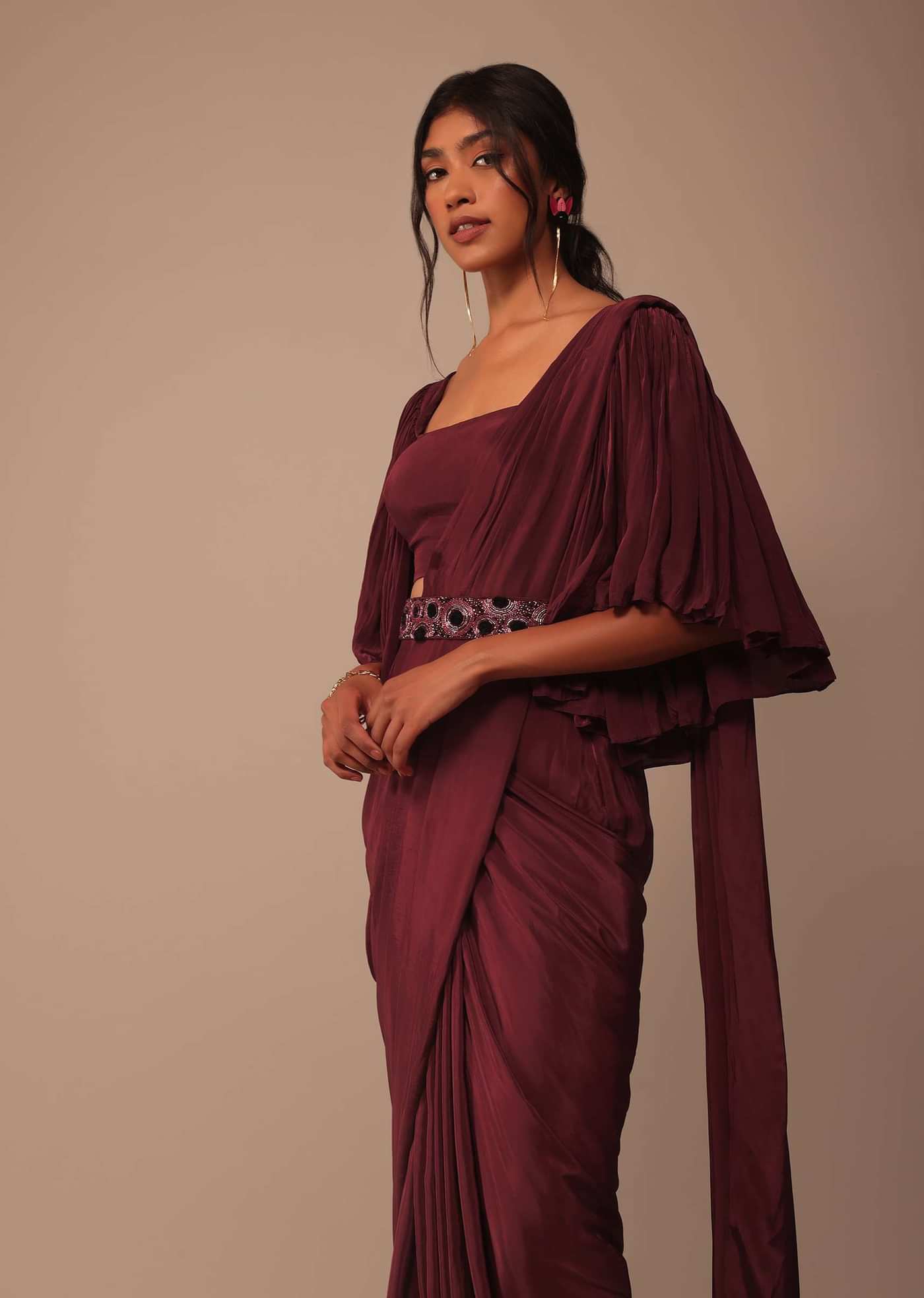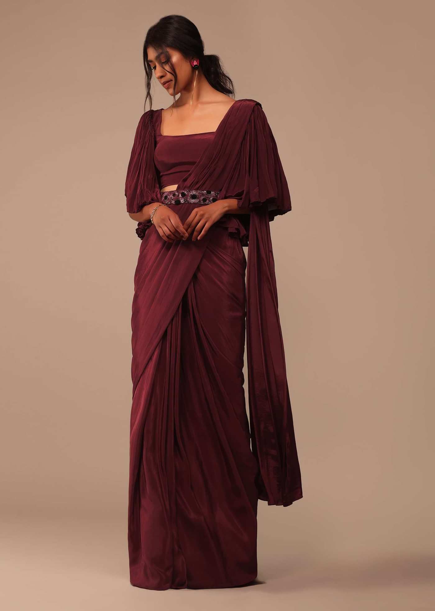 Maroon Indo-western Creep Saree Set With Embroidered Belt