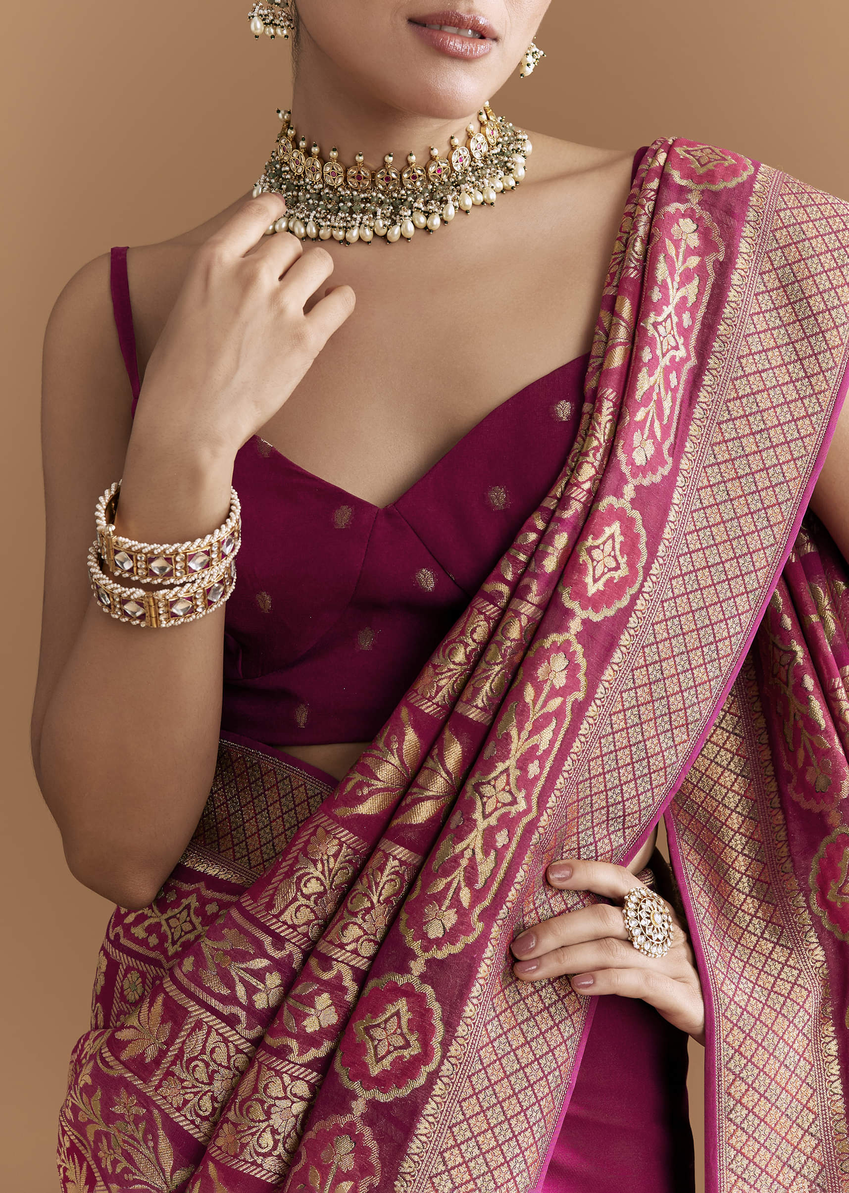 Maroon Khadhi Georgette Saree With Floral And Geometric Zari Work