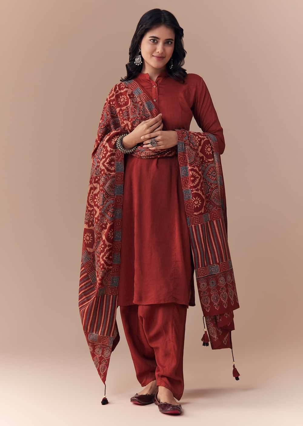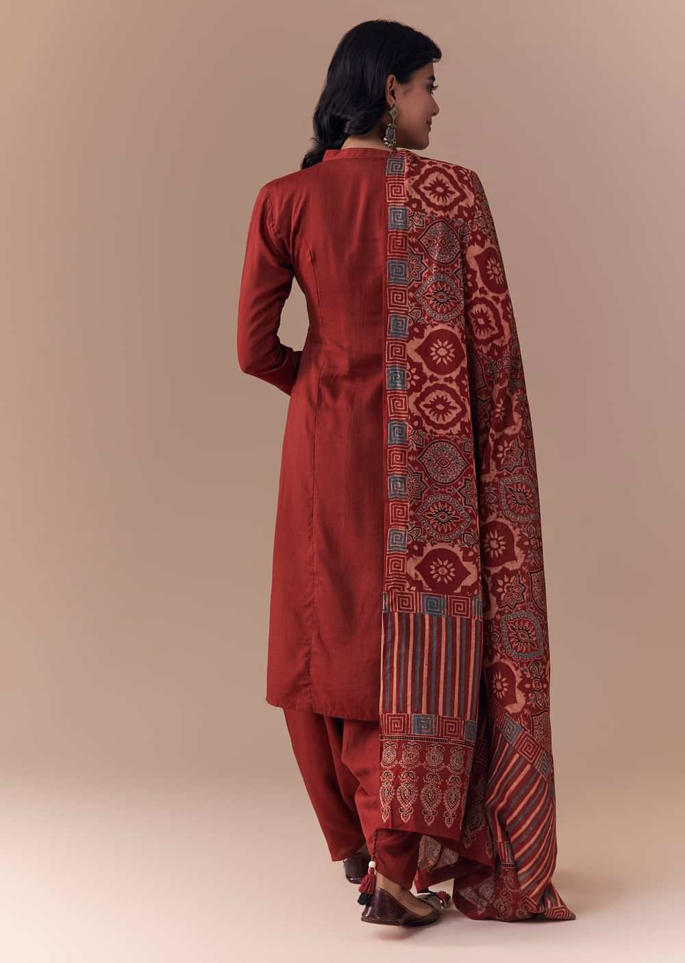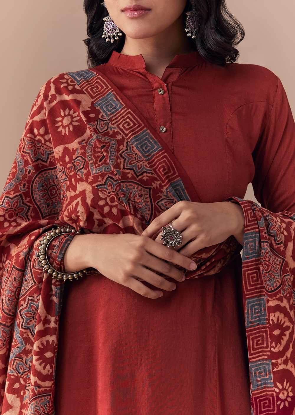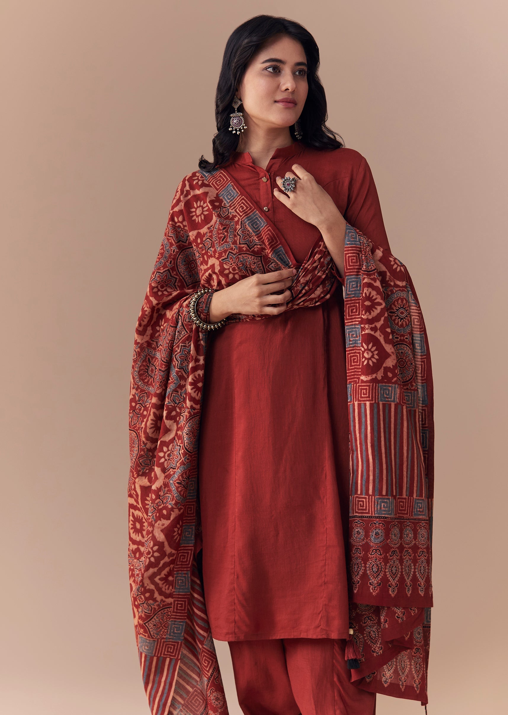 Maroon Linen Kurta Set with Handblock Ajrakh Dupatta