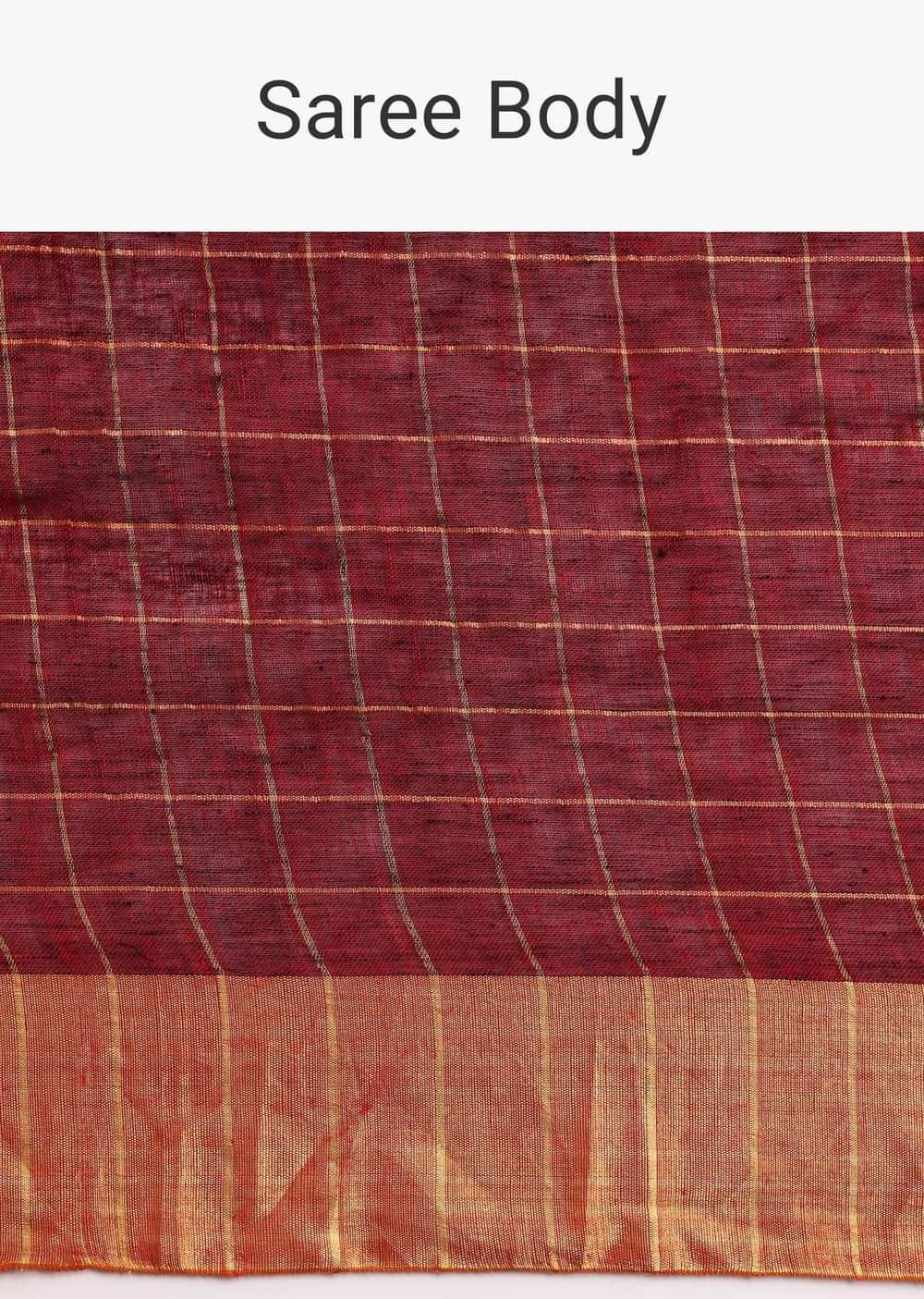 Maroon Linen Woven Saree With Zari Border And Unstitched Blouse