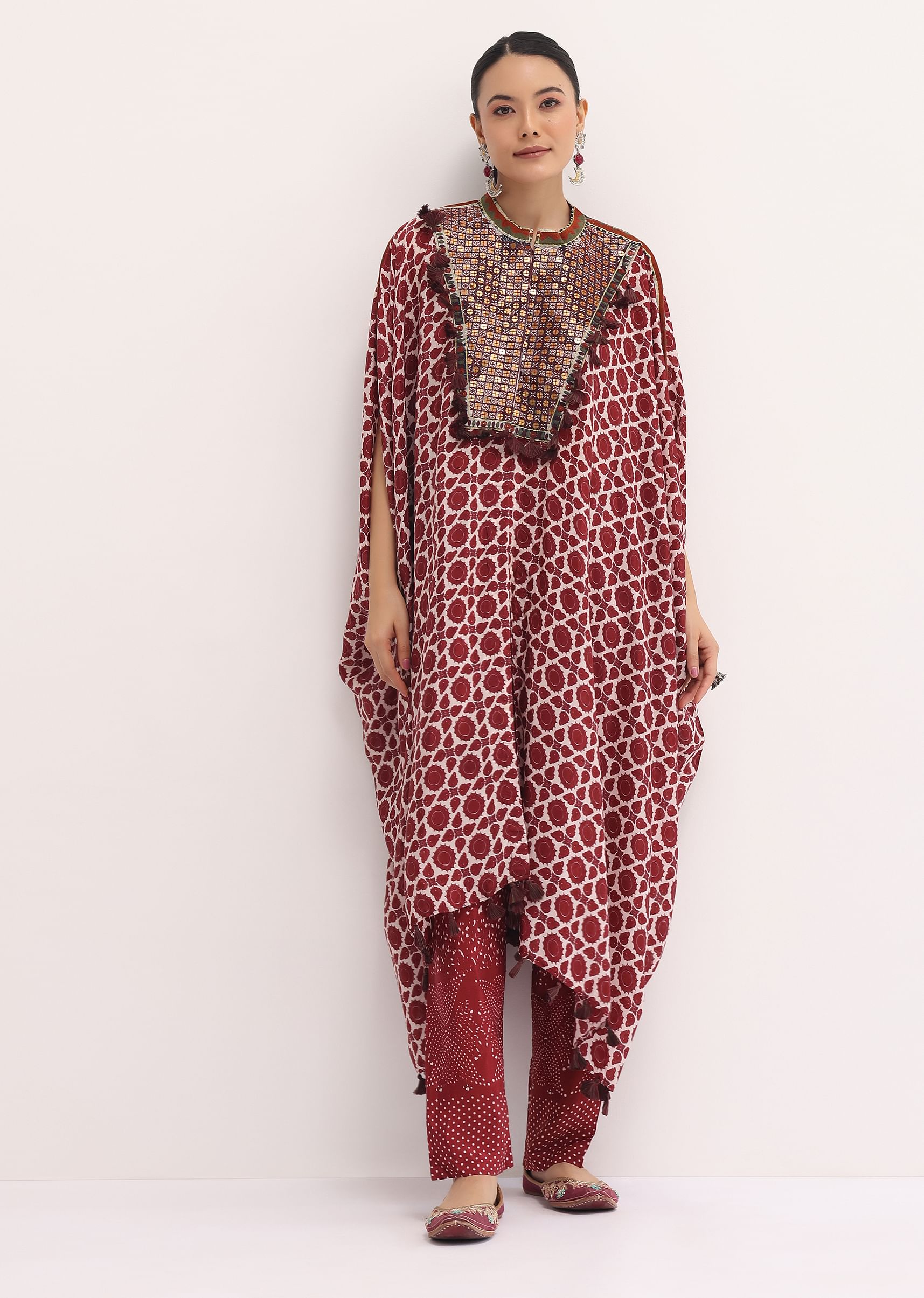 Experience the epitome of style with our meticulously crafted maroon kaftan kurta set ensemble designed specifically for fancy cocktail parties. Fabricated on a crepe base and adorned with intricate prints and sequins this kurta boasts flared sleeves and comes paired with matching pants. Awarded as the Most Trusted Brand, we're delivering styles you love, just as promised.