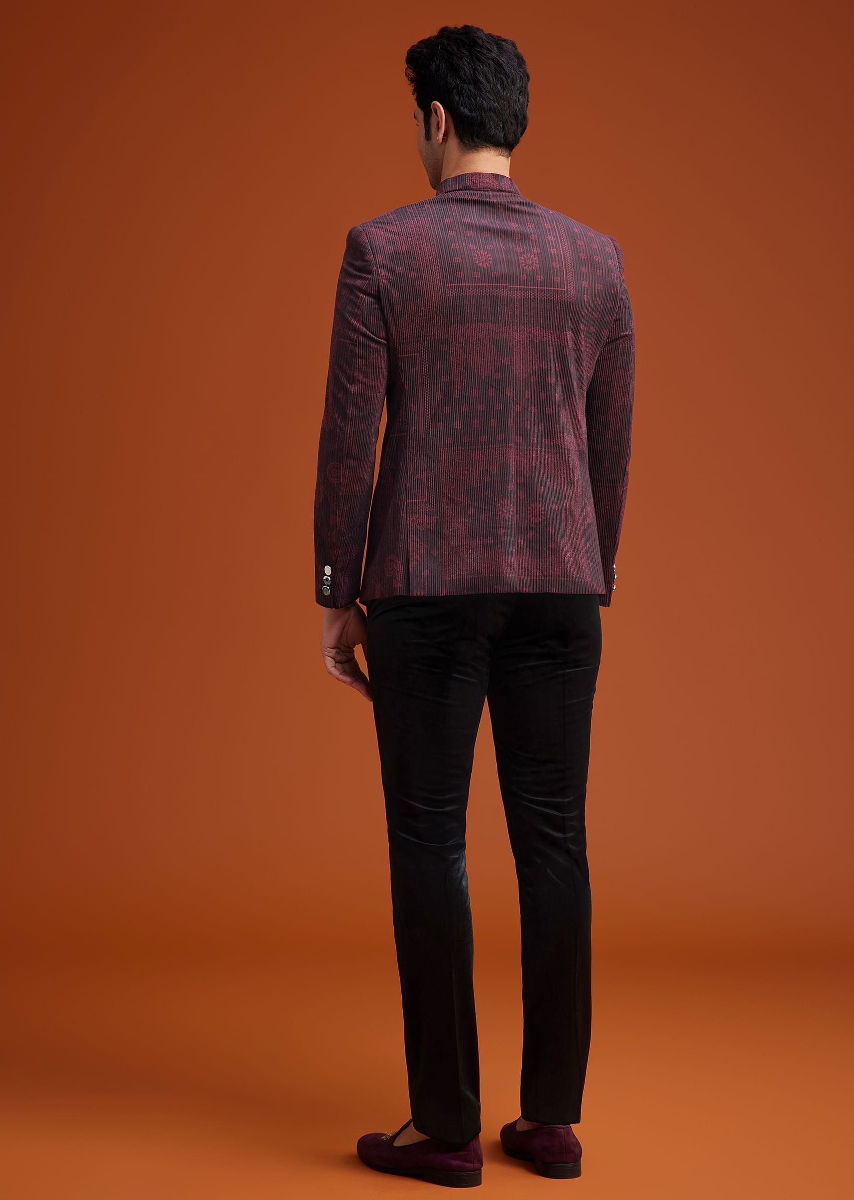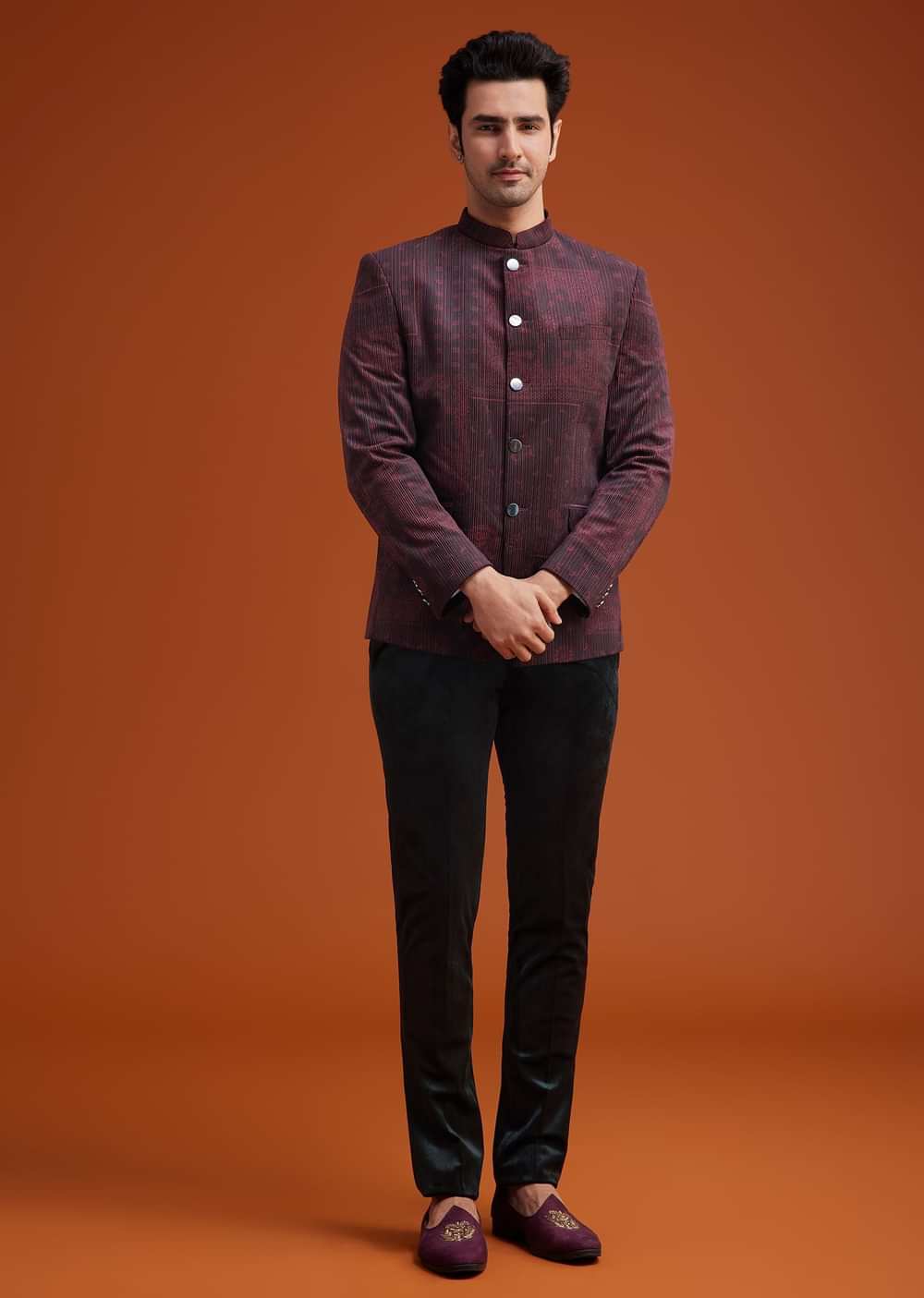 - Drape yourself in regal sophistication with this maroon printed Jodhpuri suit, a perfect blend of tradition and contemporary finesse.