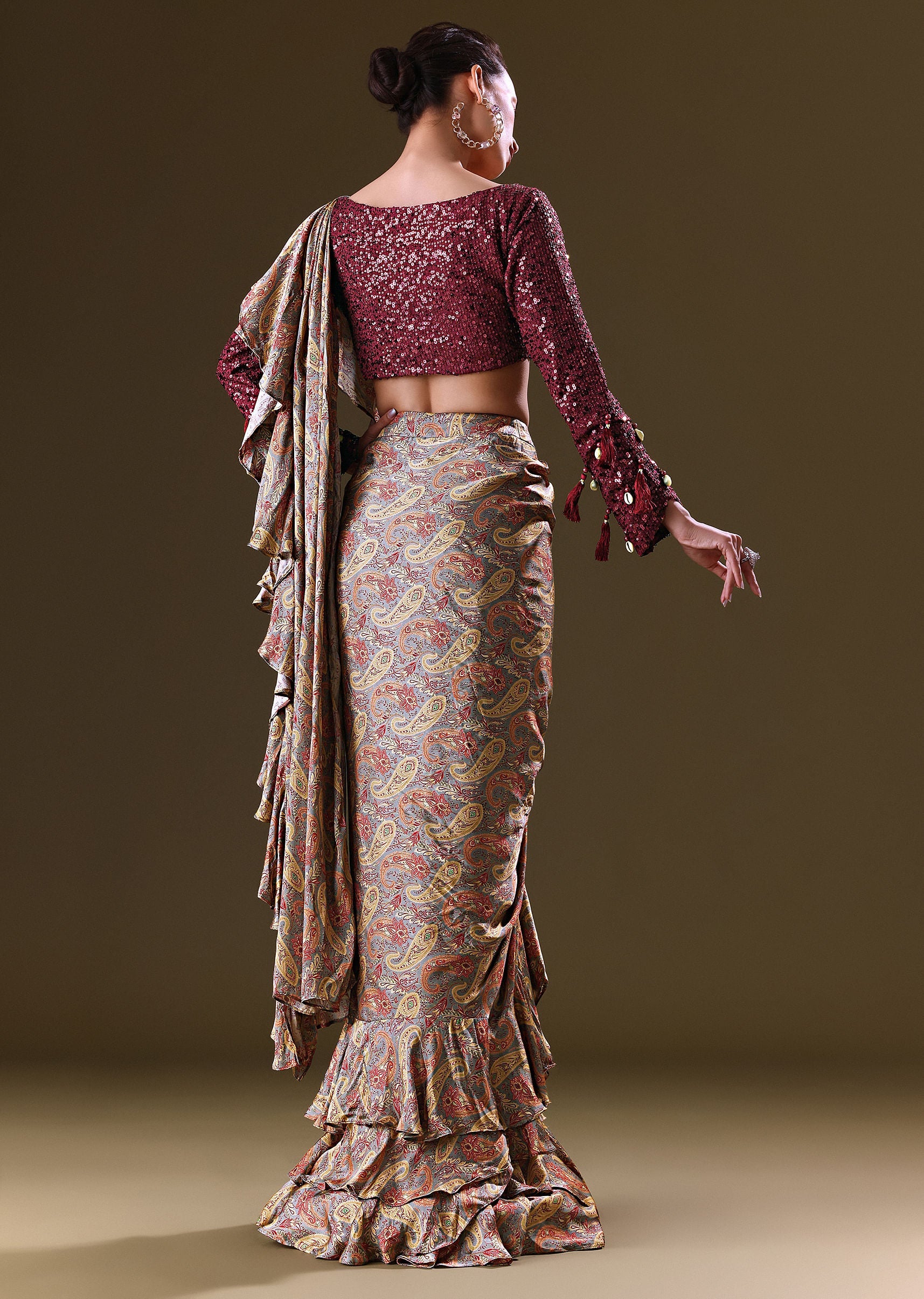 Maroon Printed Pre Stitched Frill Saree With Sequence Blouse