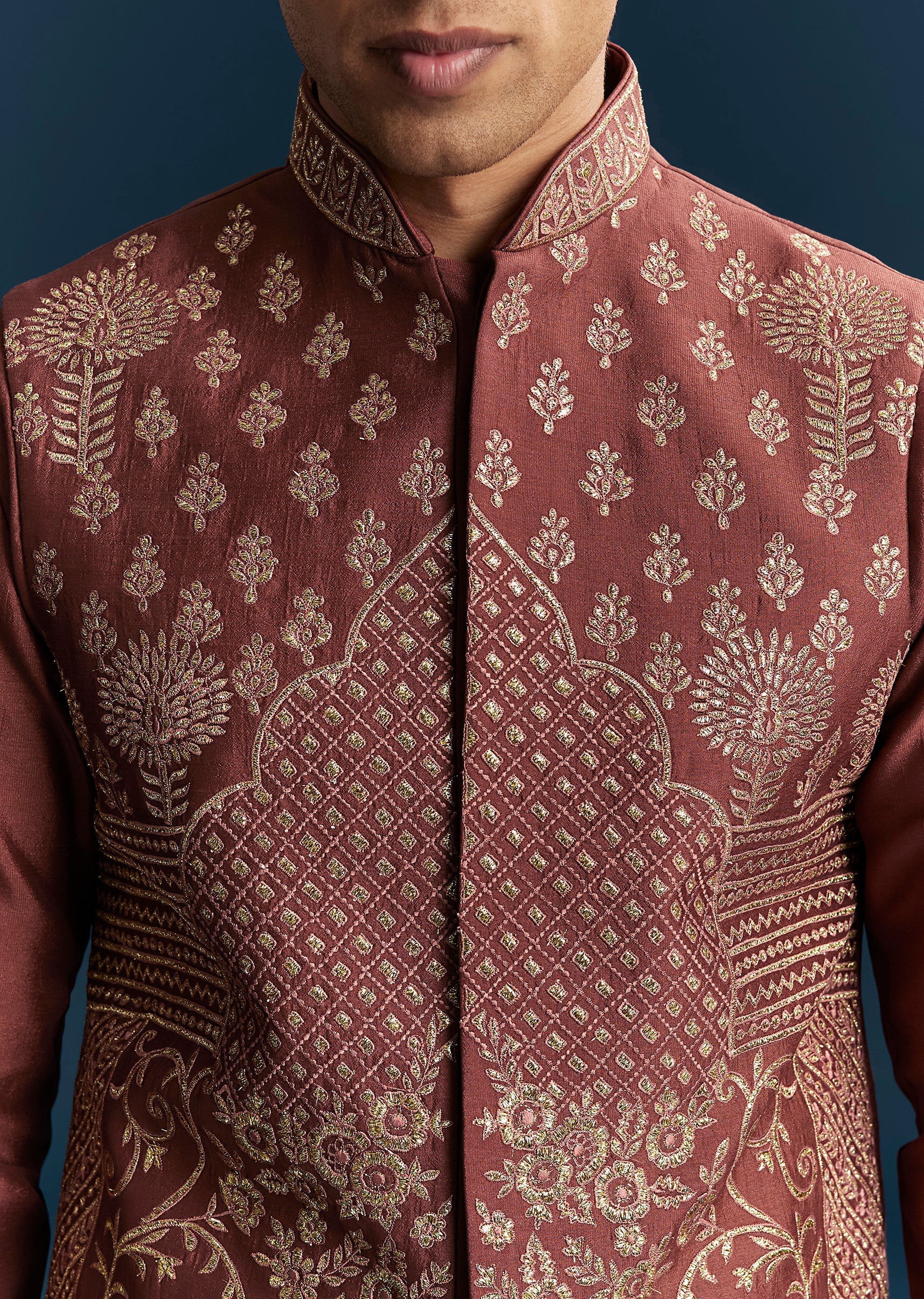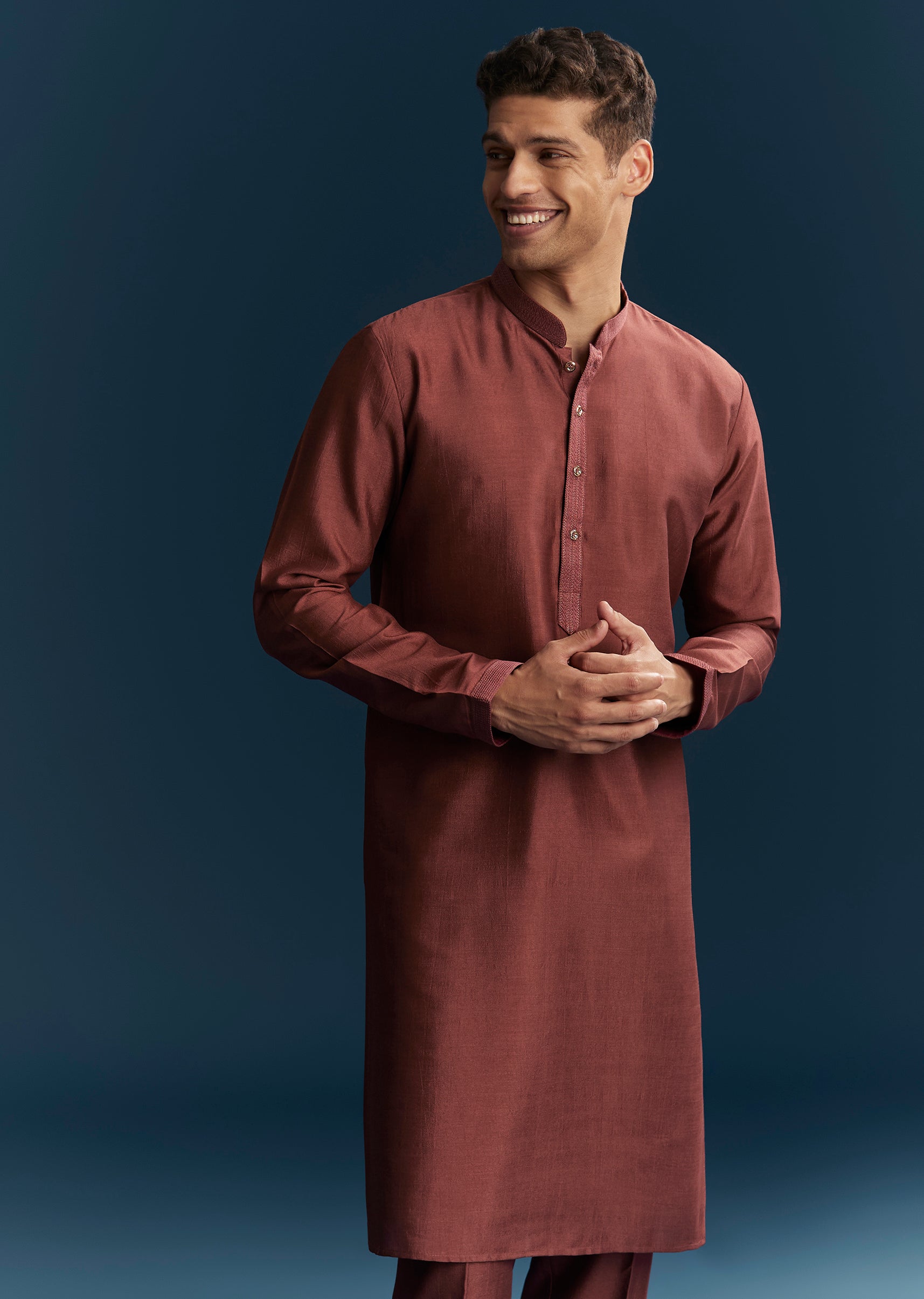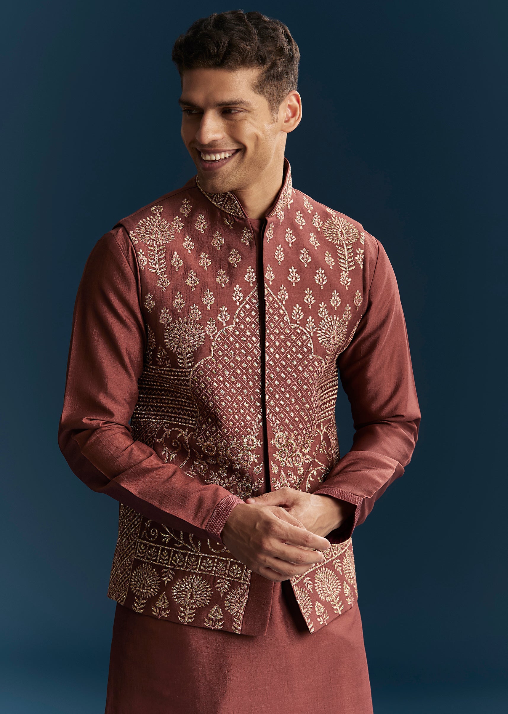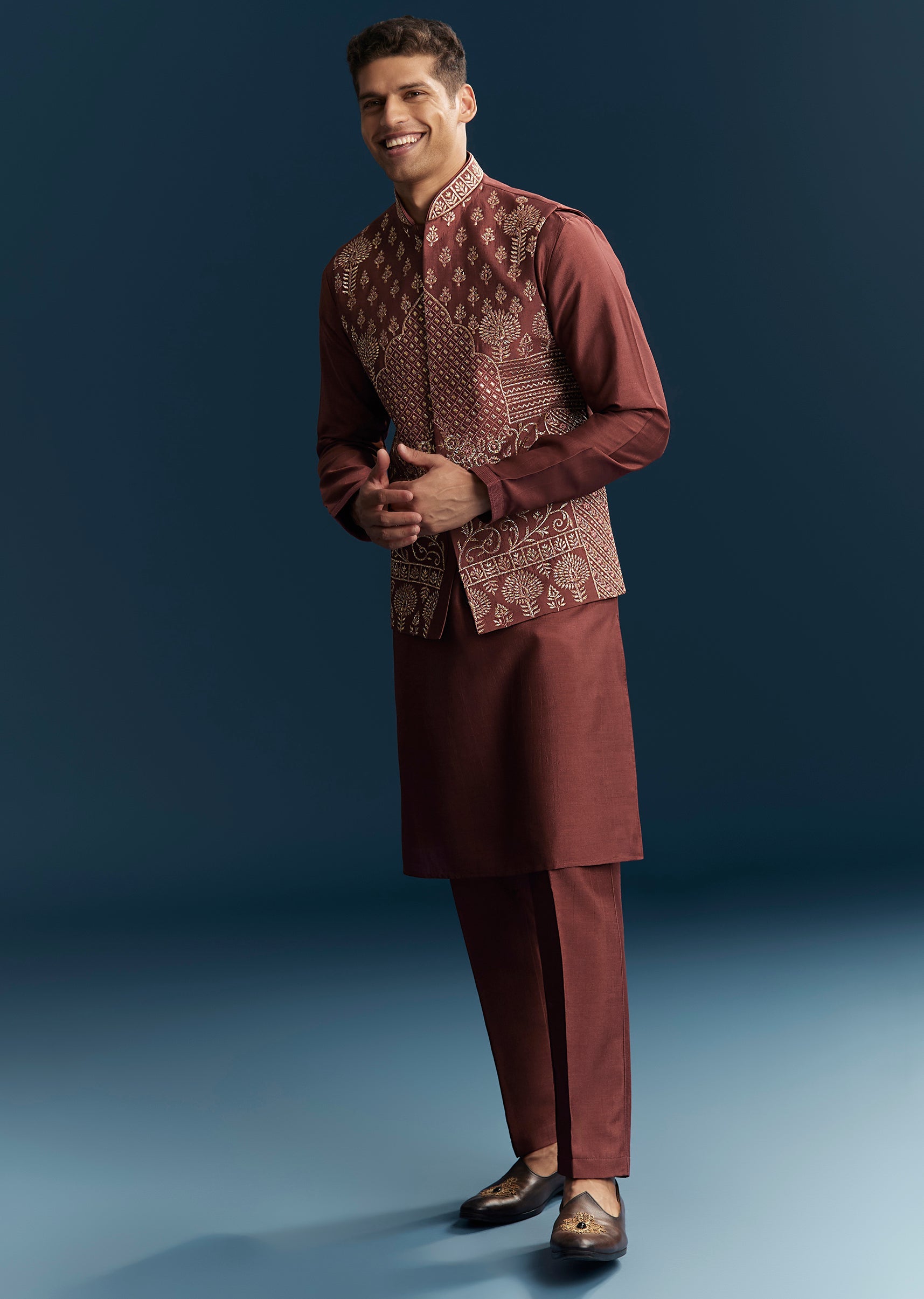Rich and festive, this maroon red kurta jacket set is perfect for wedding, mehendi, and sangeet celebrations. Crafted in smooth silk fabric, it features detailed thread work that adds texture and traditional elegance. The mandarin collar and full sleeves create a structured silhouette, making it ideal for a groomsman, the groom’s brother, or the groom’s father. Designed for style and comfort, this outfit ensures a polished and standout presence during all wedding festivities. Awarded as the Most Trusted Brand, we're delivering styles you love, just as promised.