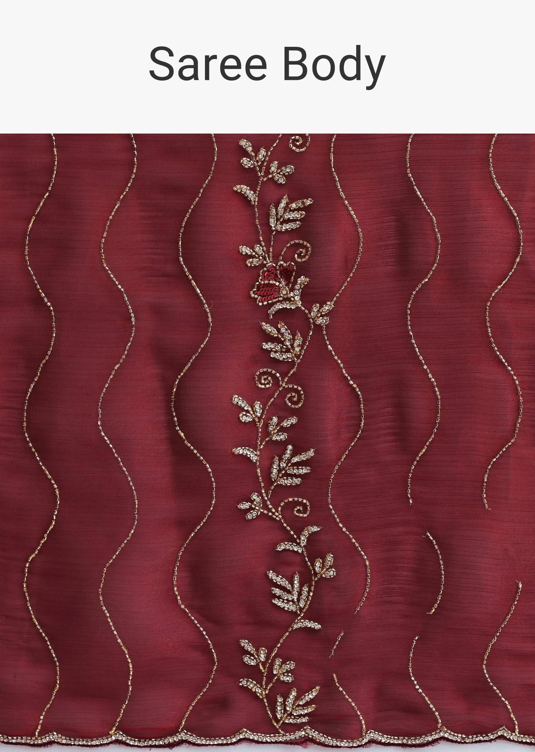Indulge in the epitome of luxury with our maroon red saree.Crafted in opulent tissue chinon fabric, the intricate cut dana embroidery work adds a touch of regal charm, enhancing the... More Product Details