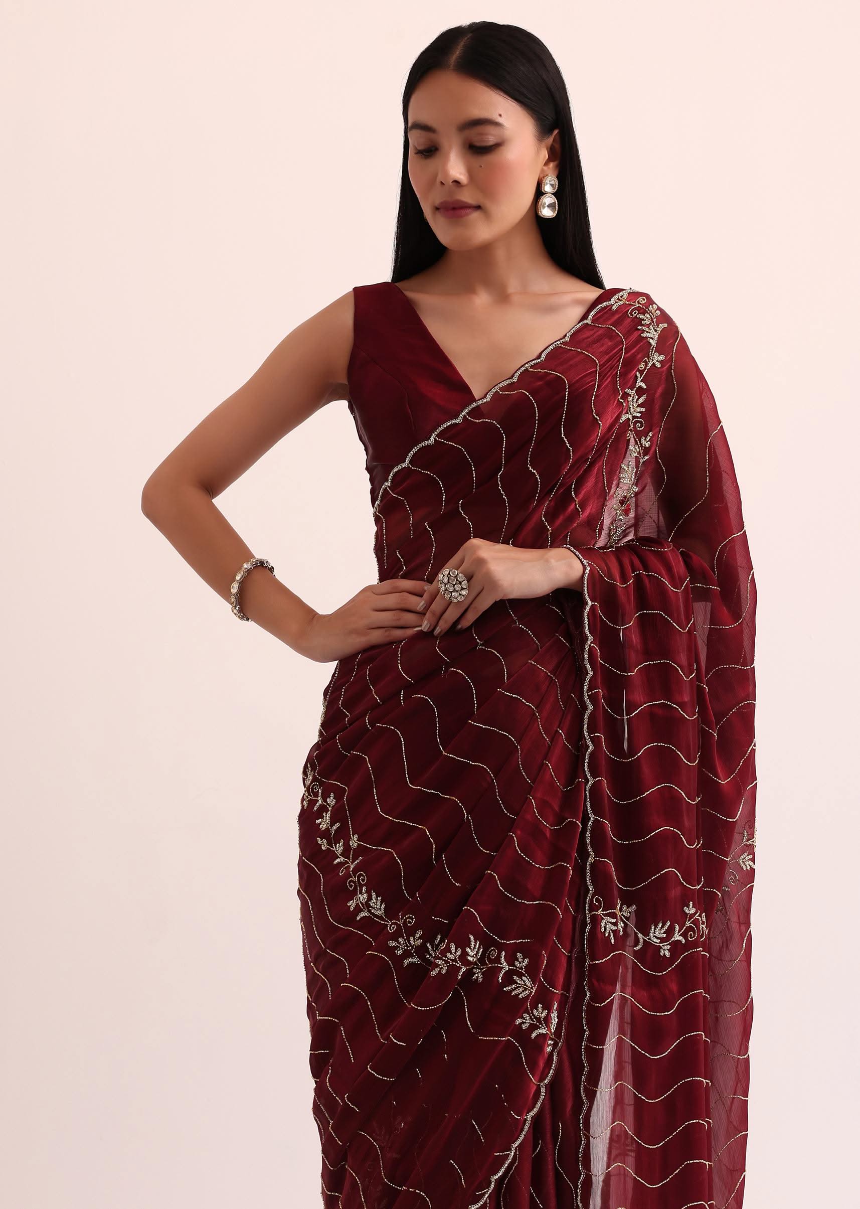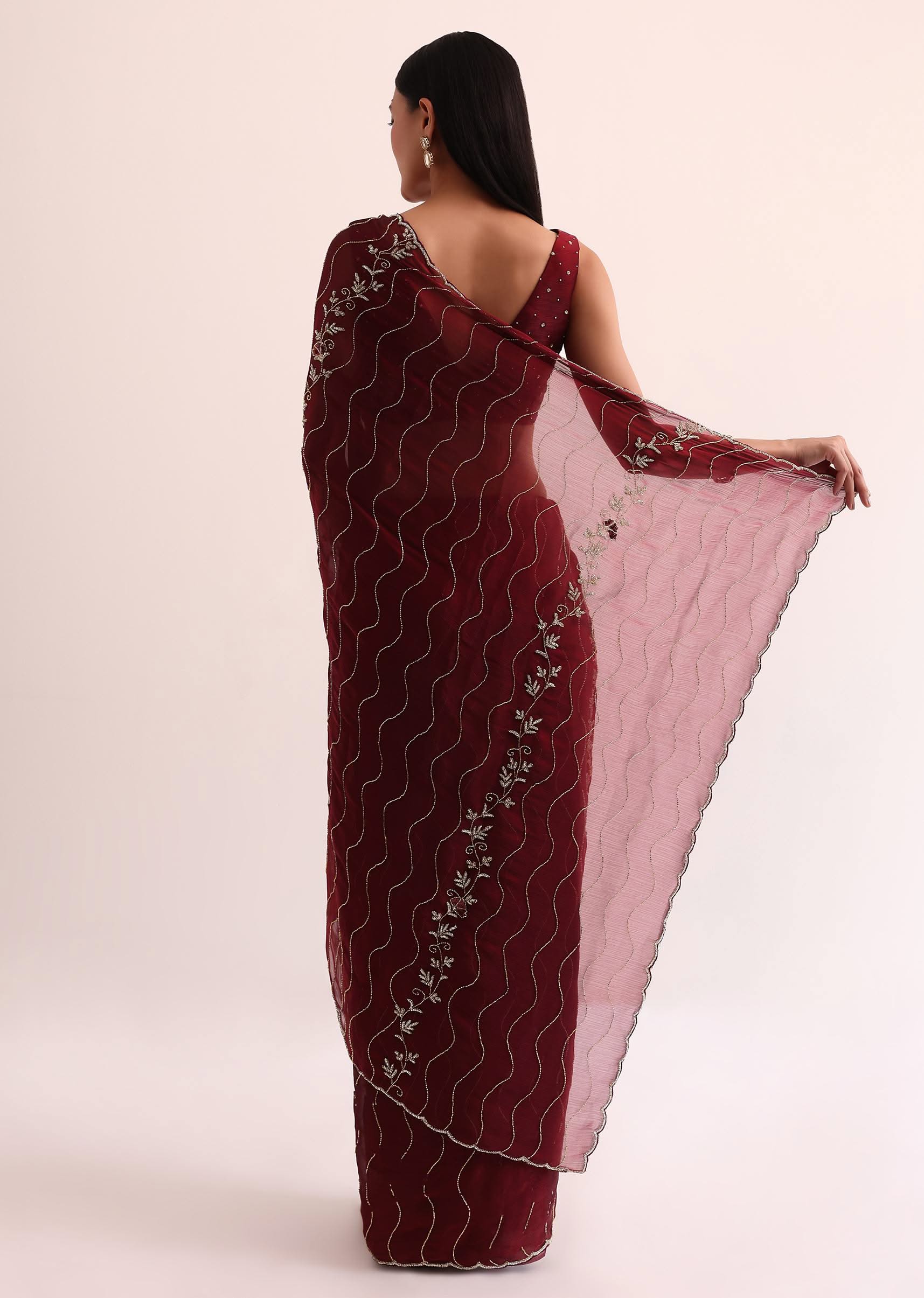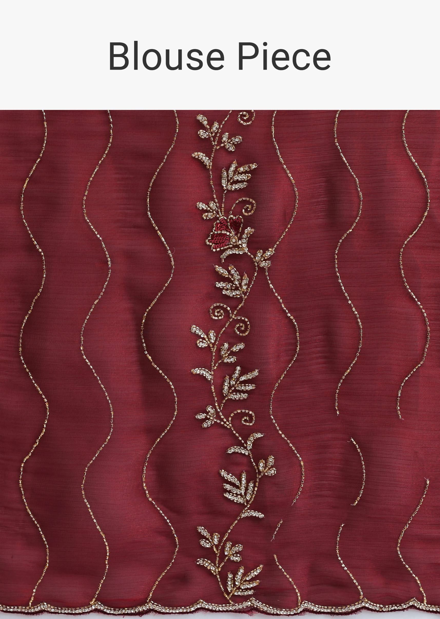 Maroon Red Tissue Saree With Cut Dana Embroidery And Unstitched Blouse