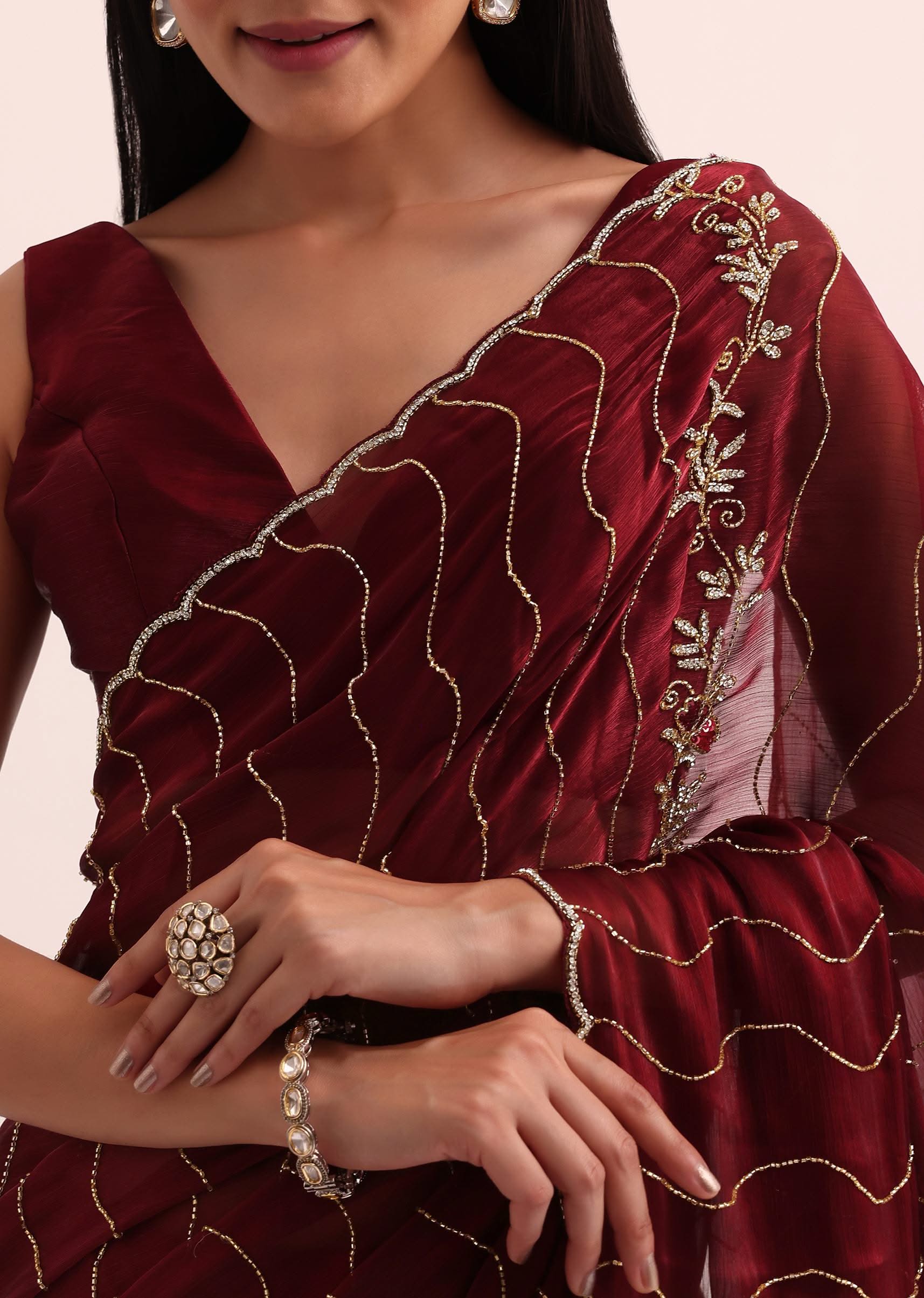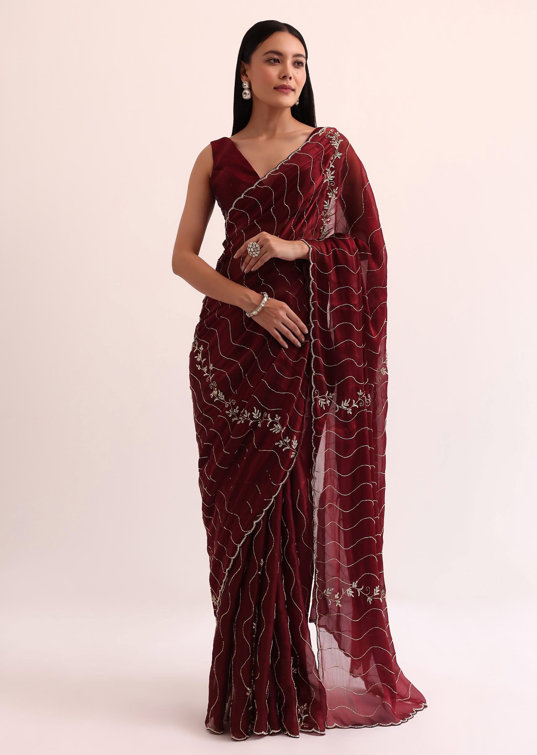 Indulge in the epitome of luxury with our maroon red saree.Crafted in opulent tissue chinon fabric, the intricate cut dana embroidery work adds a touch of regal charm, enhancing the overall allure of the saree.The saree comes with an unstitched blouse.Sequin colour may vary. Awarded as the Most Trusted Brand, we're delivering styles you love, just as promised.