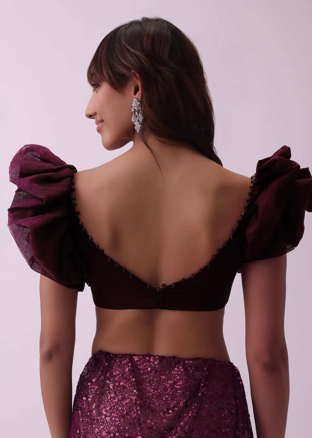 Maroon Red Sequins Saree With Fancy Flower Shaped Blouse