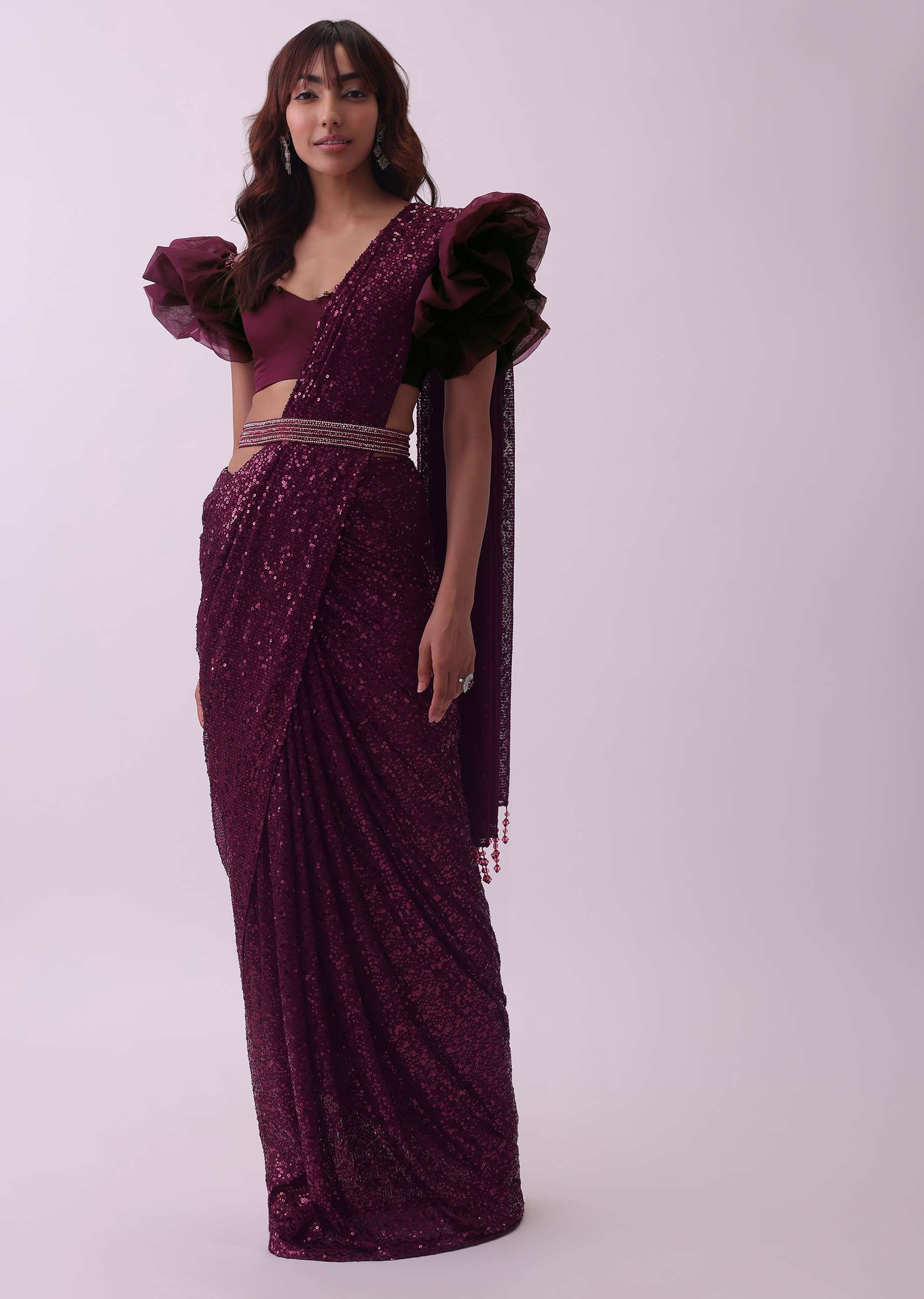 Make a grand entrance with our maroon red sequins saree.This mesmerizing ensemble is designed to turn heads and steal the spotlight.The saree comes with a stitched flower shaped blouse with fancy sleeves and a bead and pearl embellished belt.EVENT - This glamorous ready-to-wear ensemble is an absolute showstopper, ideal for cocktail parties and receptions. Awarded as the Most Trusted Brand, we're delivering styles you love, just as promised.