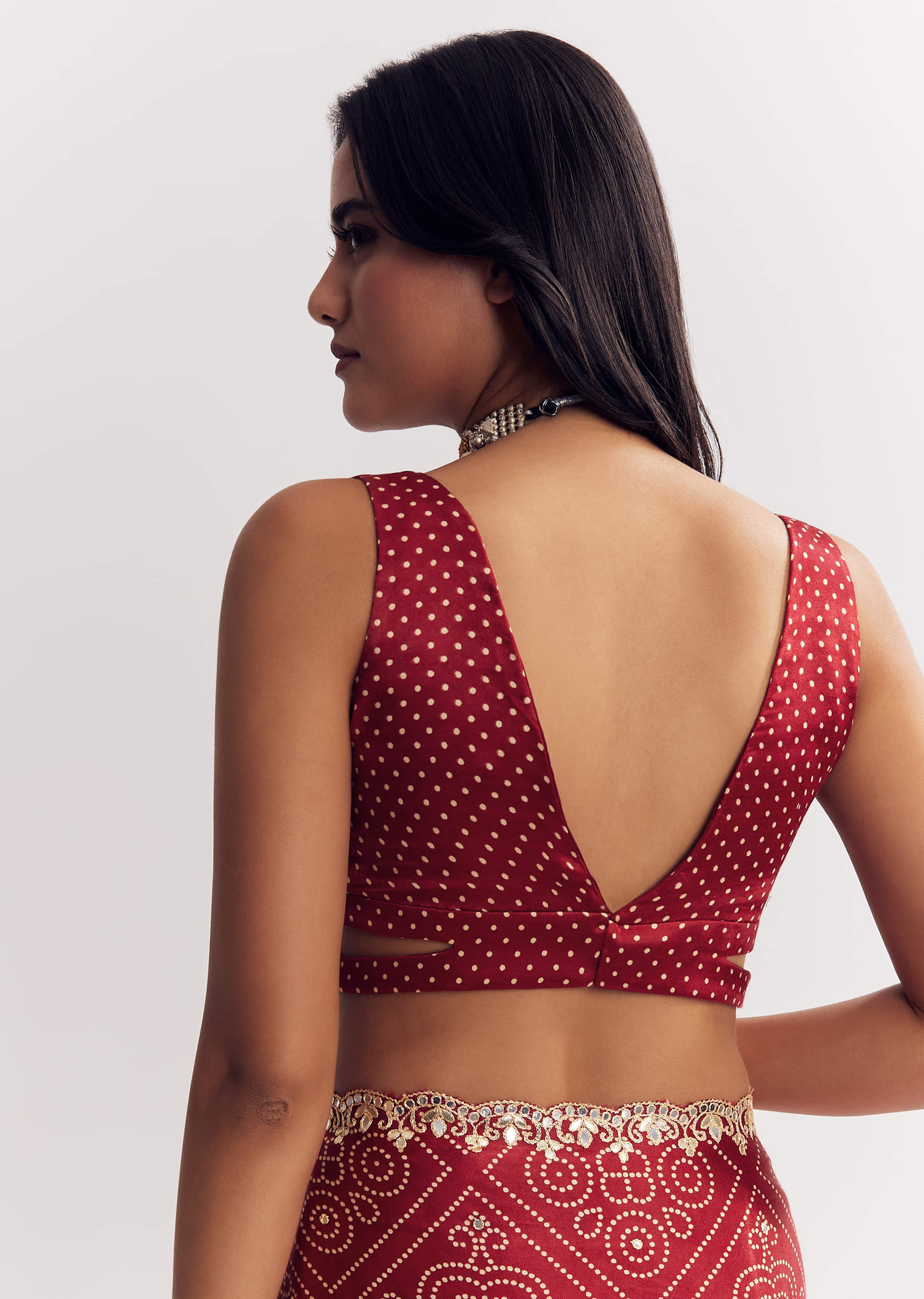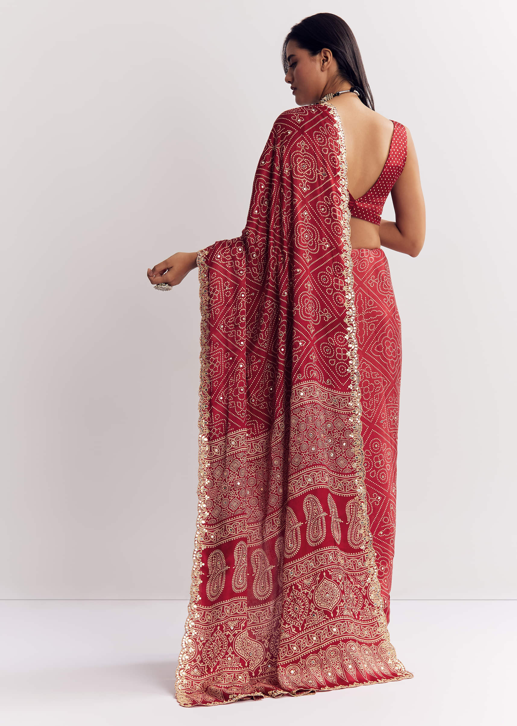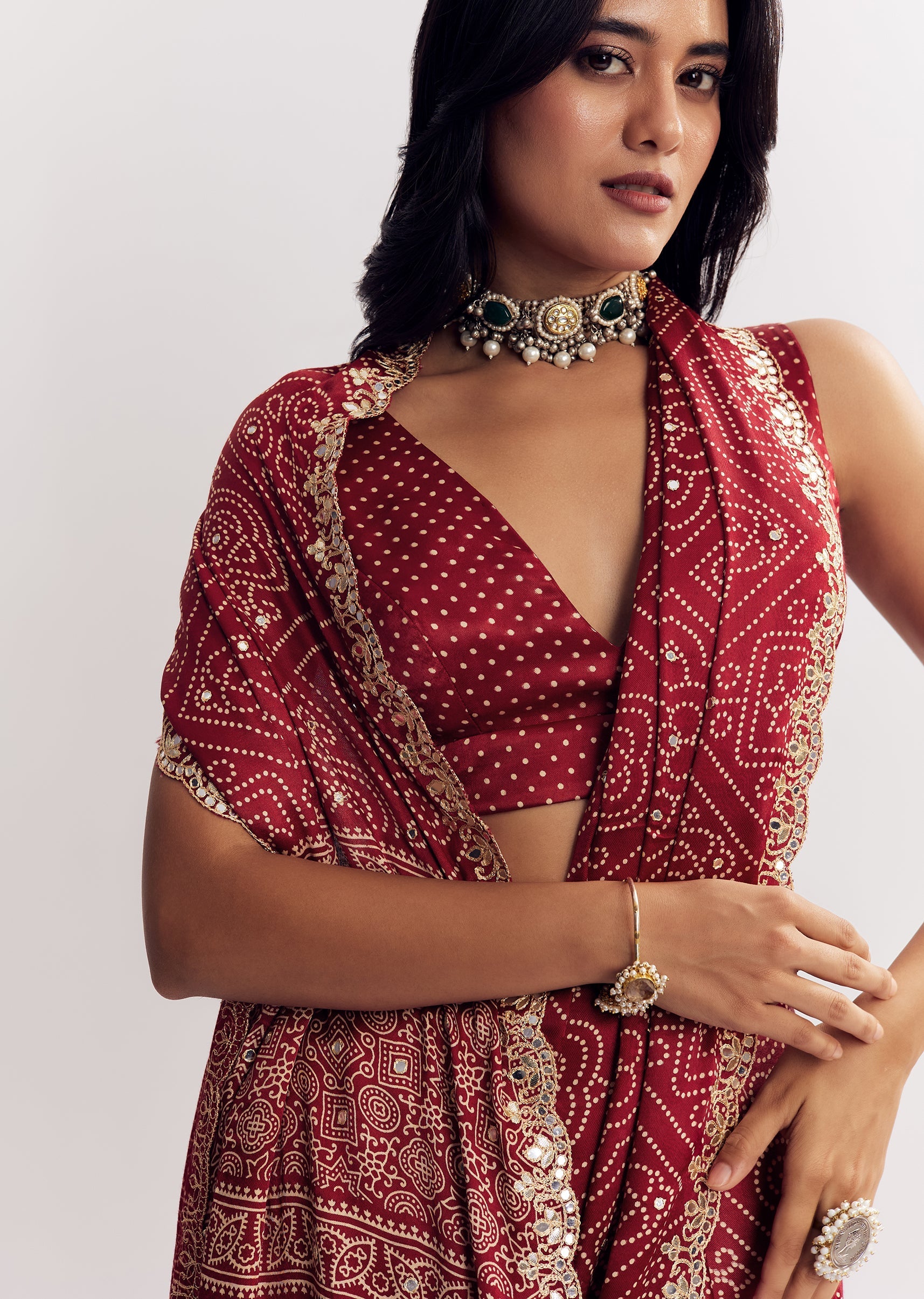 Maroon Satin Ajrakh Printed Saree With Gota And Sequins