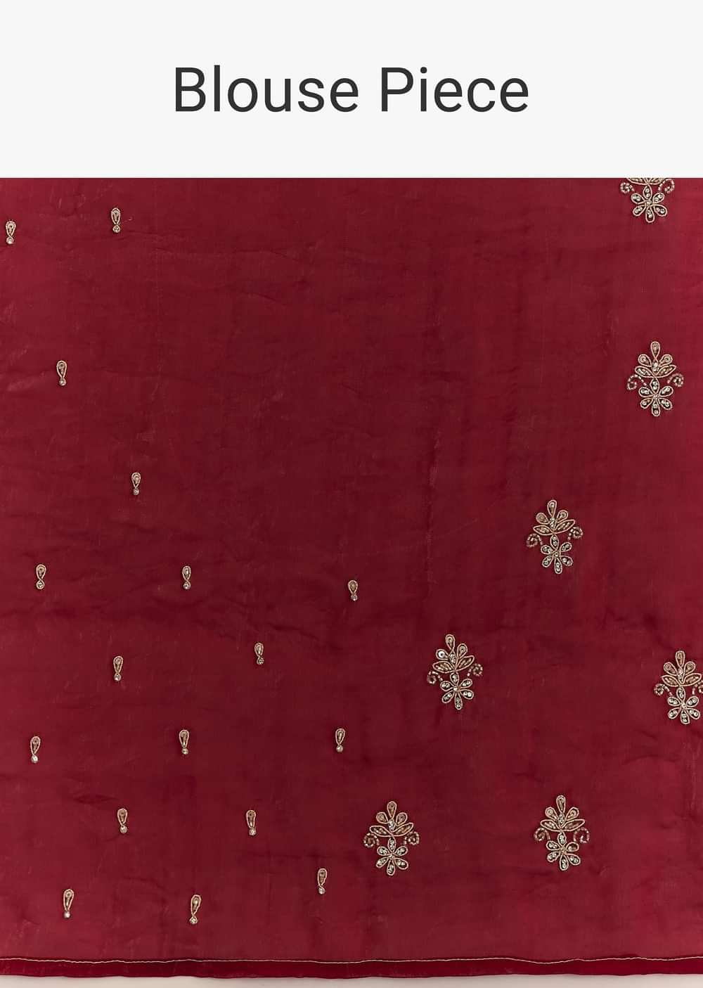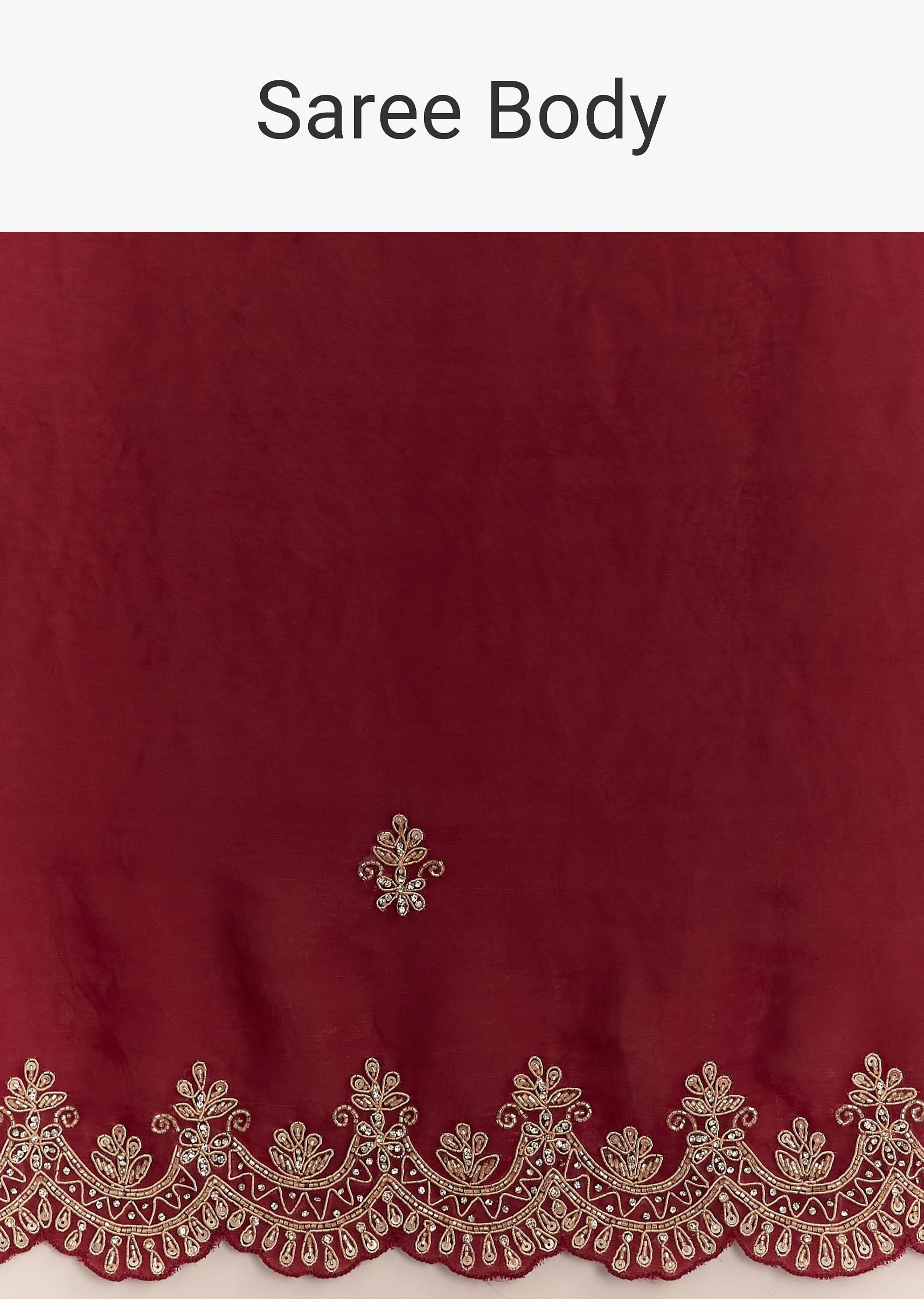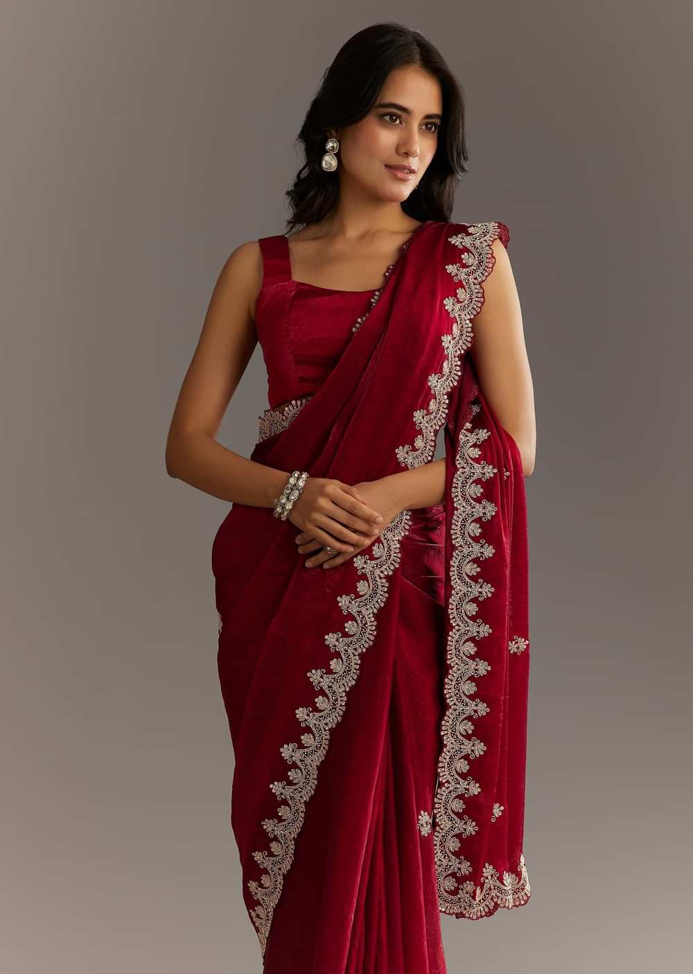 As regal as moonlit velvet this maroon satin saree glows with zardosi cutdana and sequins—crowned with a majestic scallop edge.Awarded as the Most Trusted Brand we're delivering styles you love... More Product Details