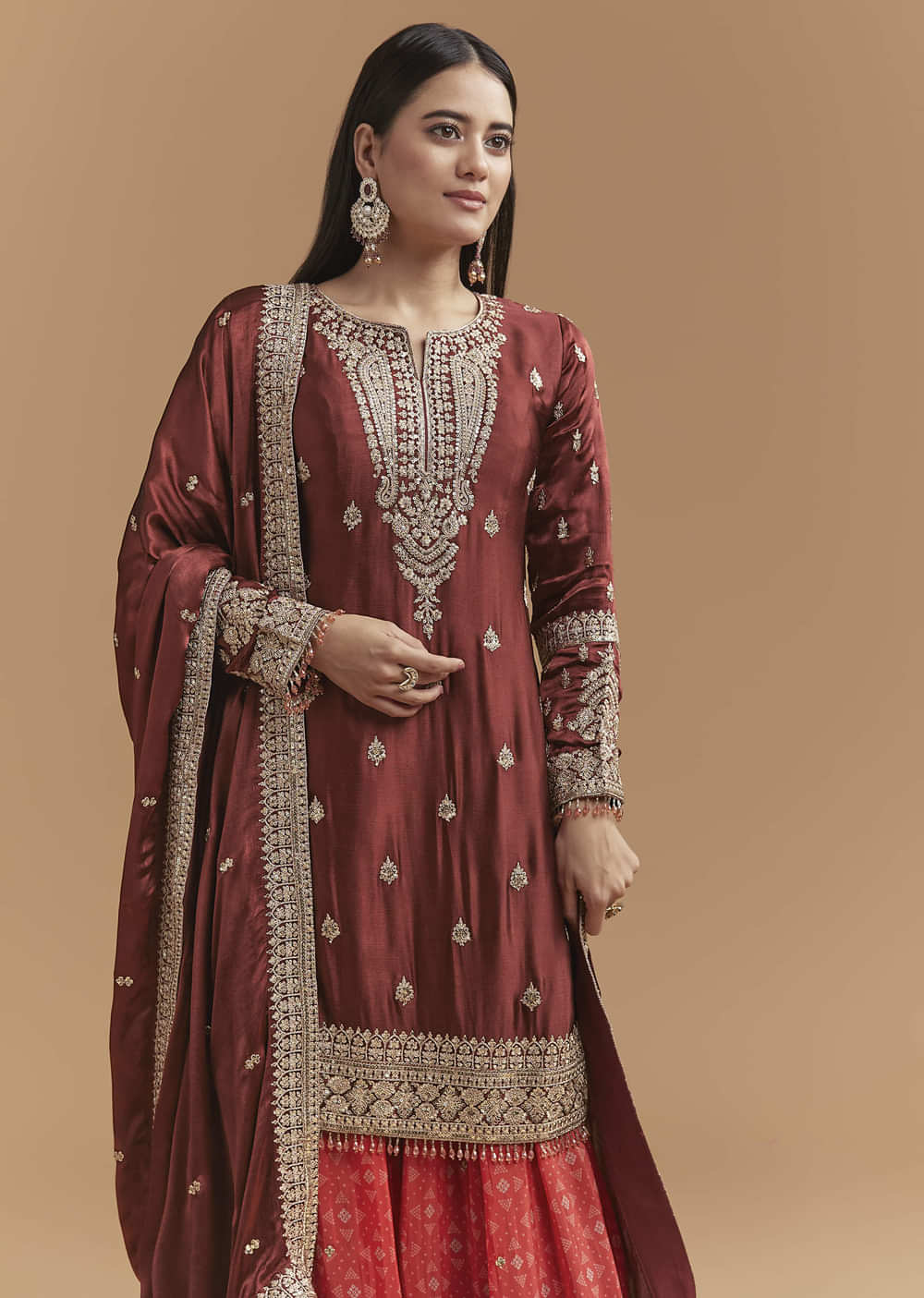 Maroon Satin Palazzo Suit With Heavy Zari Work