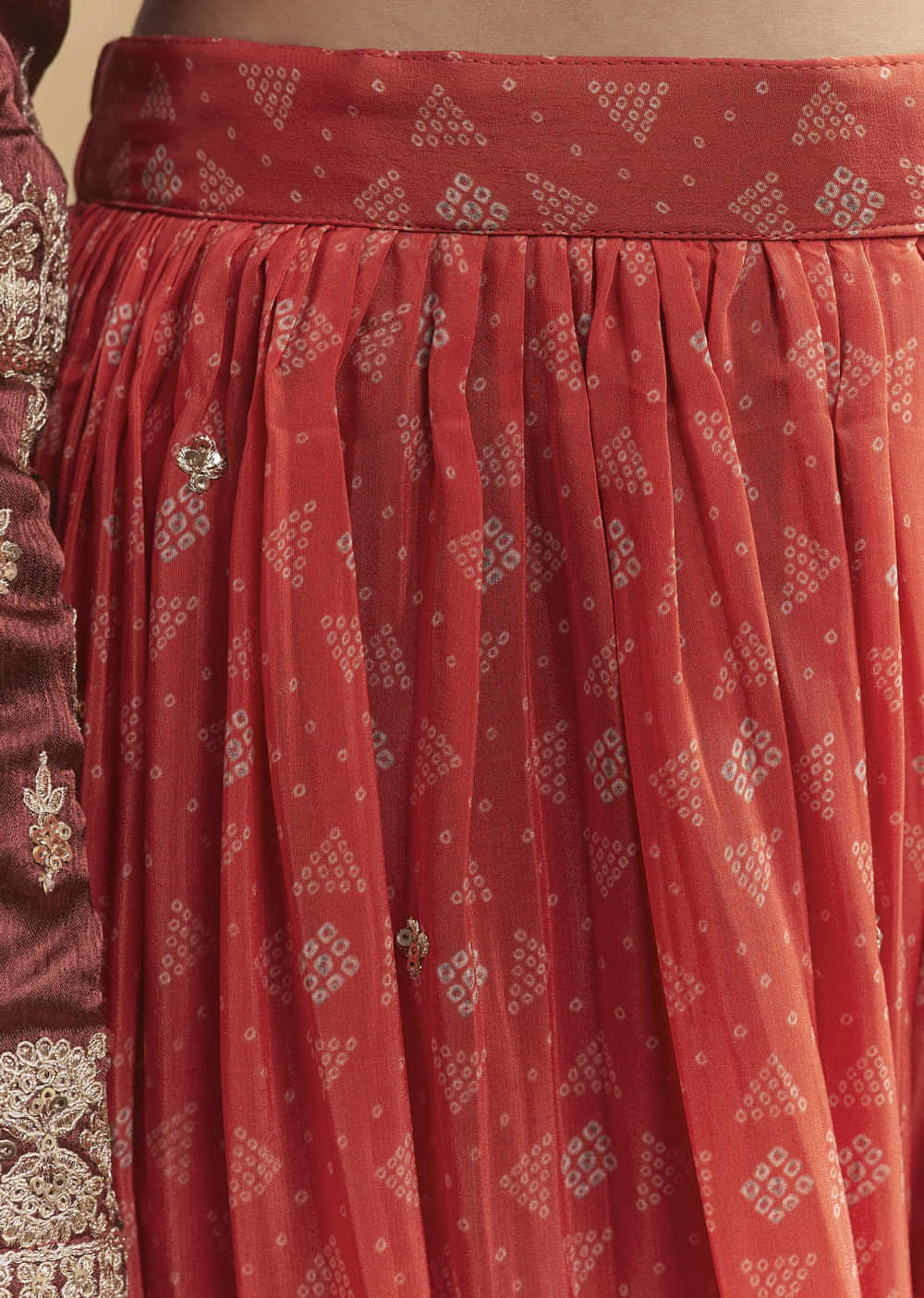 Depth and polish define this maroon satin palazzo suit, where the kurta carries heavy zari with sequins and the palazzo features a subtle bandhani print for contrast. Satin’s fluid shine... More Product Details