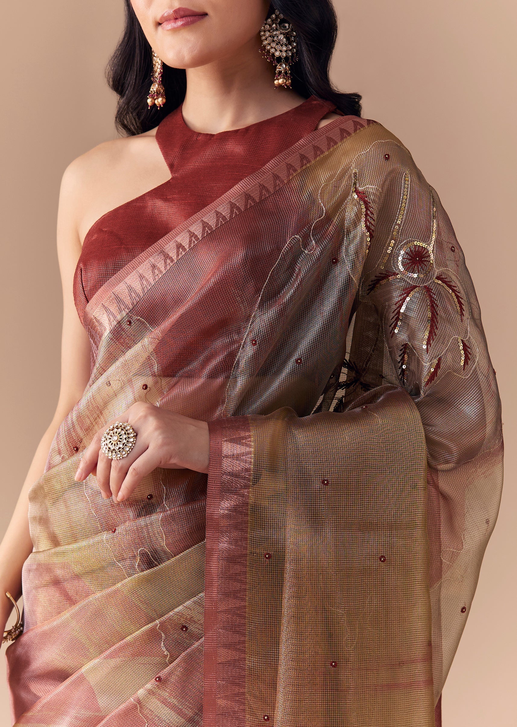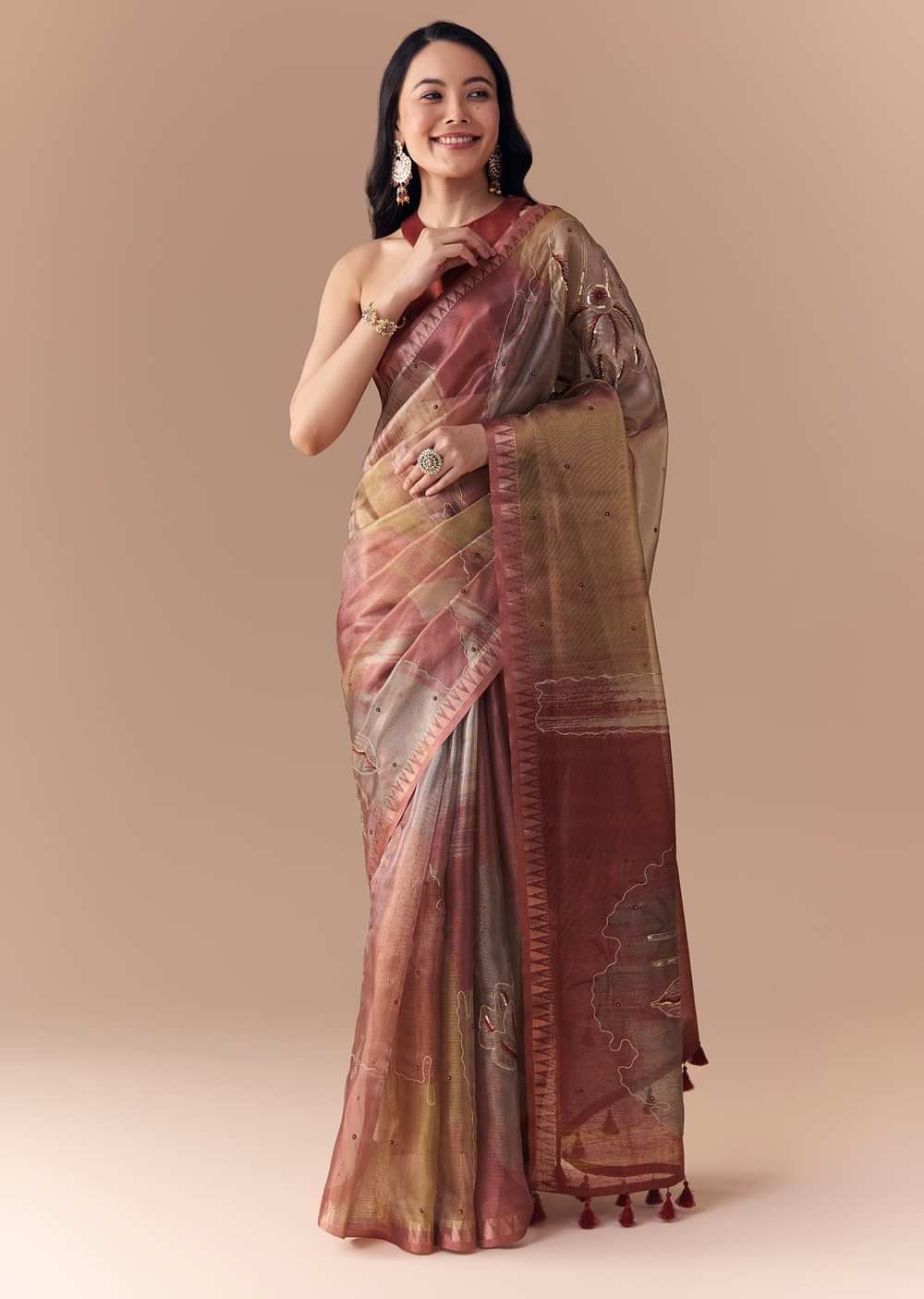 Maroon Shaded Organza Silk Saree with Unstitched Blouse