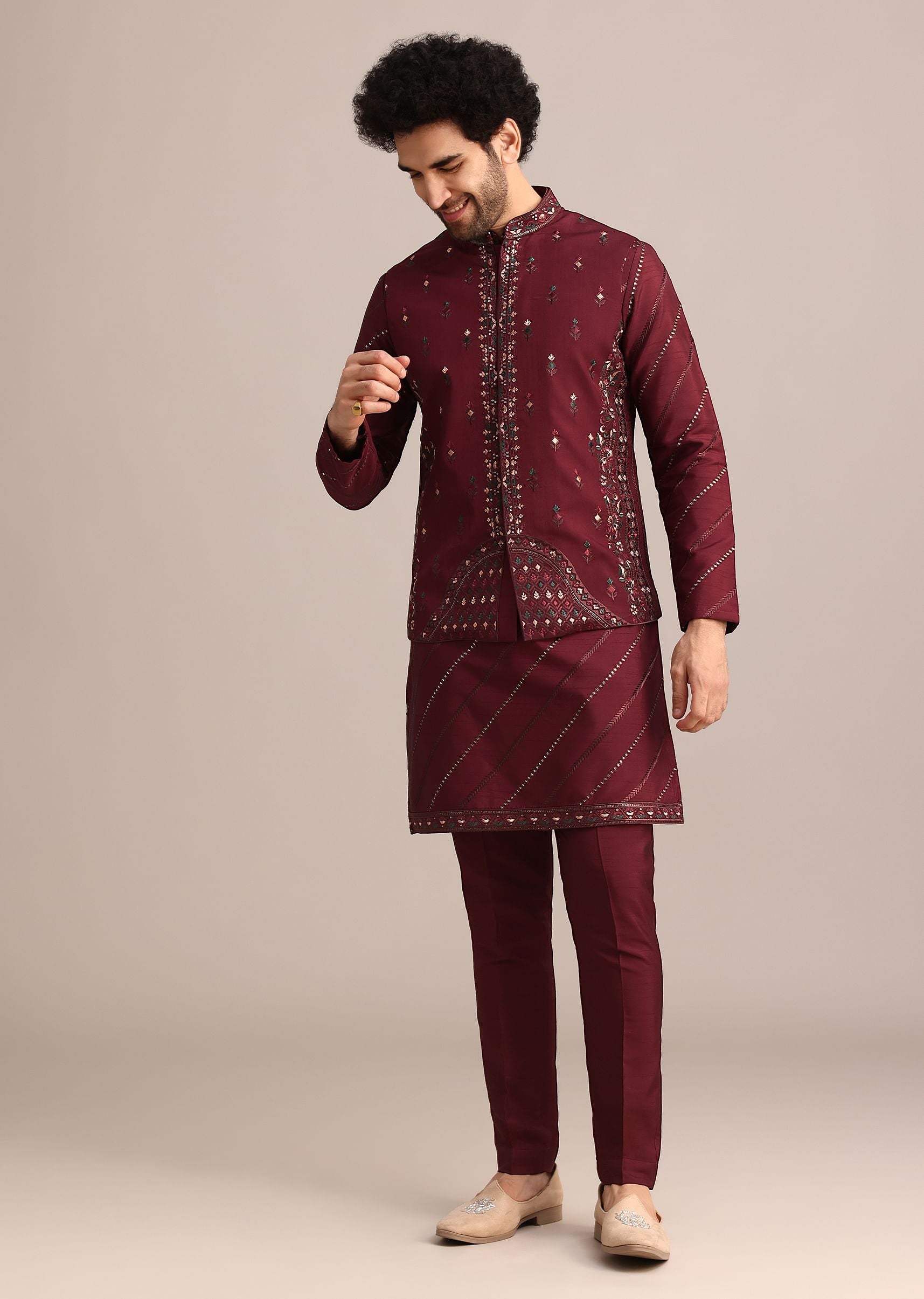 Maroon Silk Jacket Kurta Set With Embroidered Work