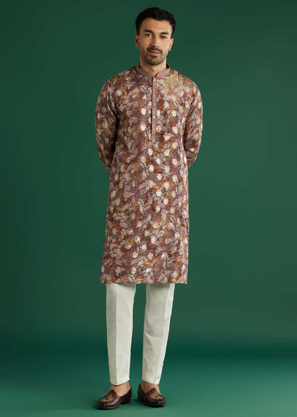 Twilight richness defines this maroon art silk men’s kurta set, detailed with intricate floral motifs in gold and beige. The band collar and buttoned placket bring a tailored finish to the flowing print. Bring it out for casual or festive functions when warm tone and heritage pattern feel right. Awarded as the Most Trusted Brand, we're delivering styles you love, just as promised.
