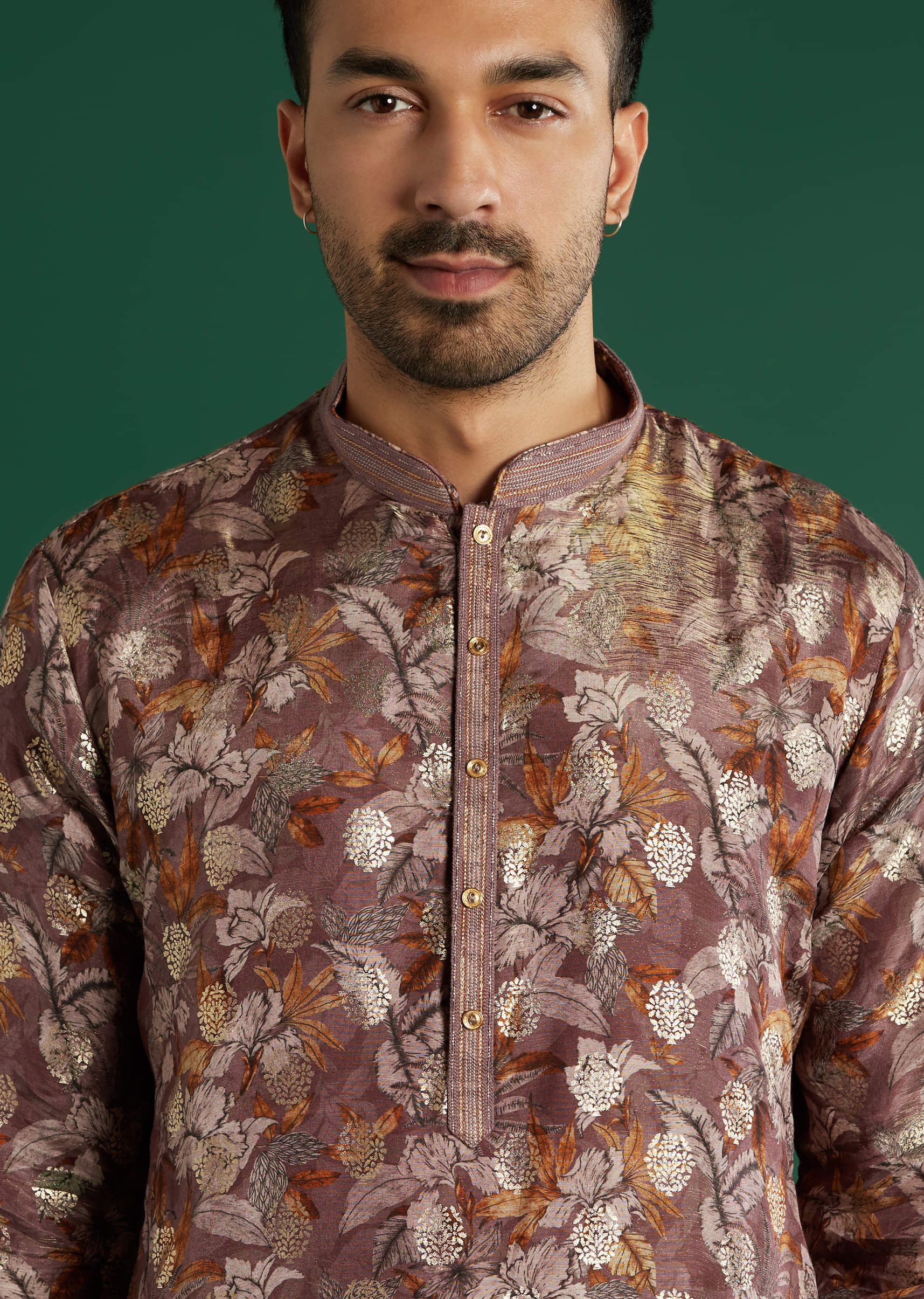 Twilight richness defines this maroon art silk men’s kurta set, detailed with intricate floral motifs in gold and beige. The band collar and buttoned placket bring a tailored finish to... More Product Details