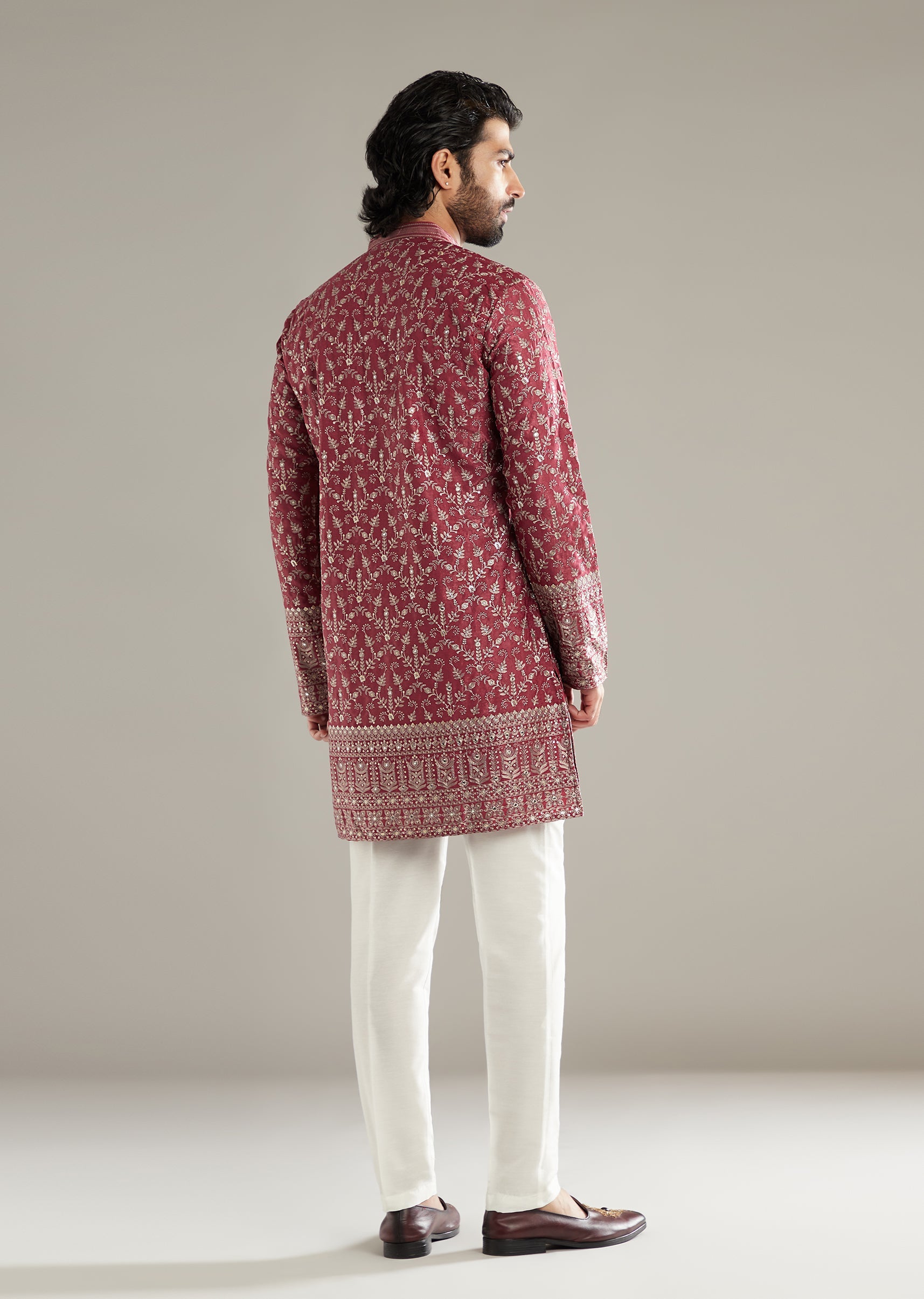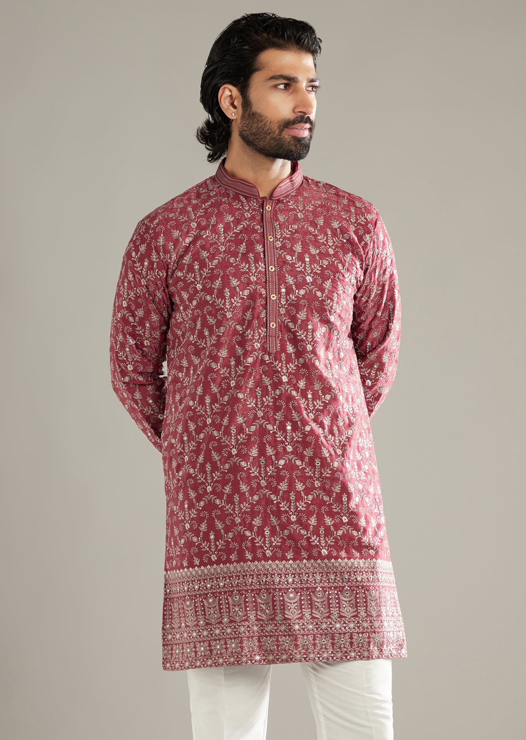 Designed to stand out, this maroon art silk men’s kurta set stacks dense resham and sequins into floral patterns that feel festive yet refined. The shorter length sharpens the profile... More Product Details