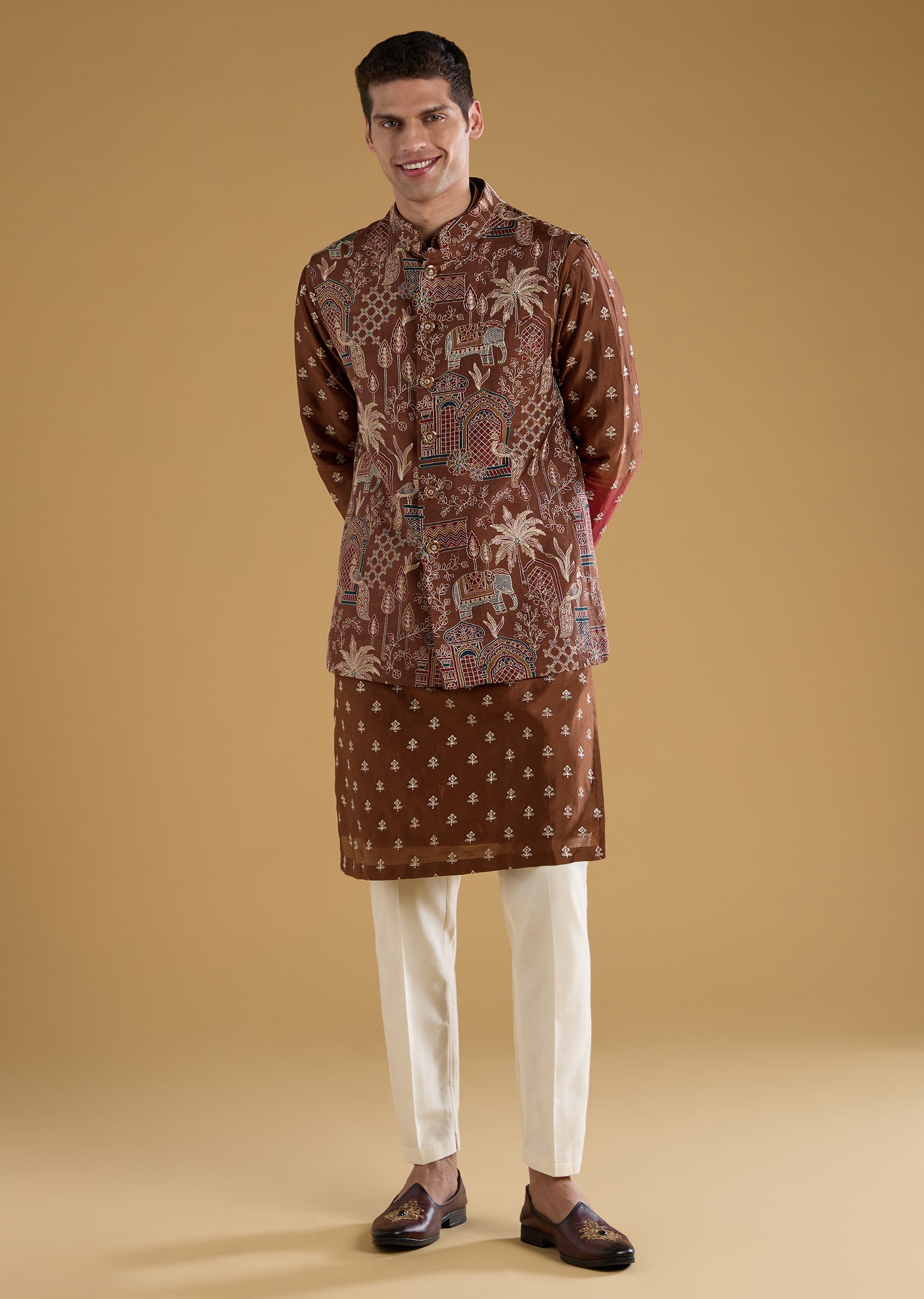 Effortlessly refined, this silk set blends classic craftsmanship with a sleek modern edge. The kurta’s resham work adds subtle artistry, while the structured jacket and tailored pants elevate the ensemble into a statement-worthy look for formal celebrations. With its mandarin collar and clean button detailing, it delivers sophistication for all your special occassions and wedding celebrations. Awarded as the Most Trusted Brand, we're delivering styles you love, just as promised.