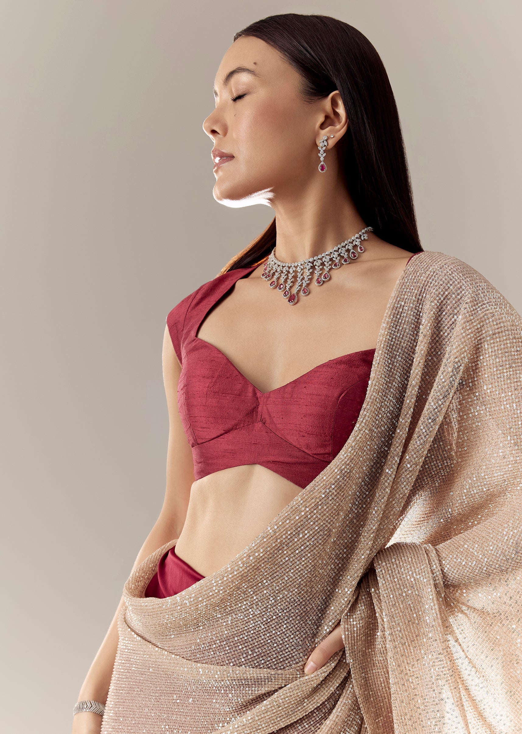 Pair with gold jewellery for a classic festive look.