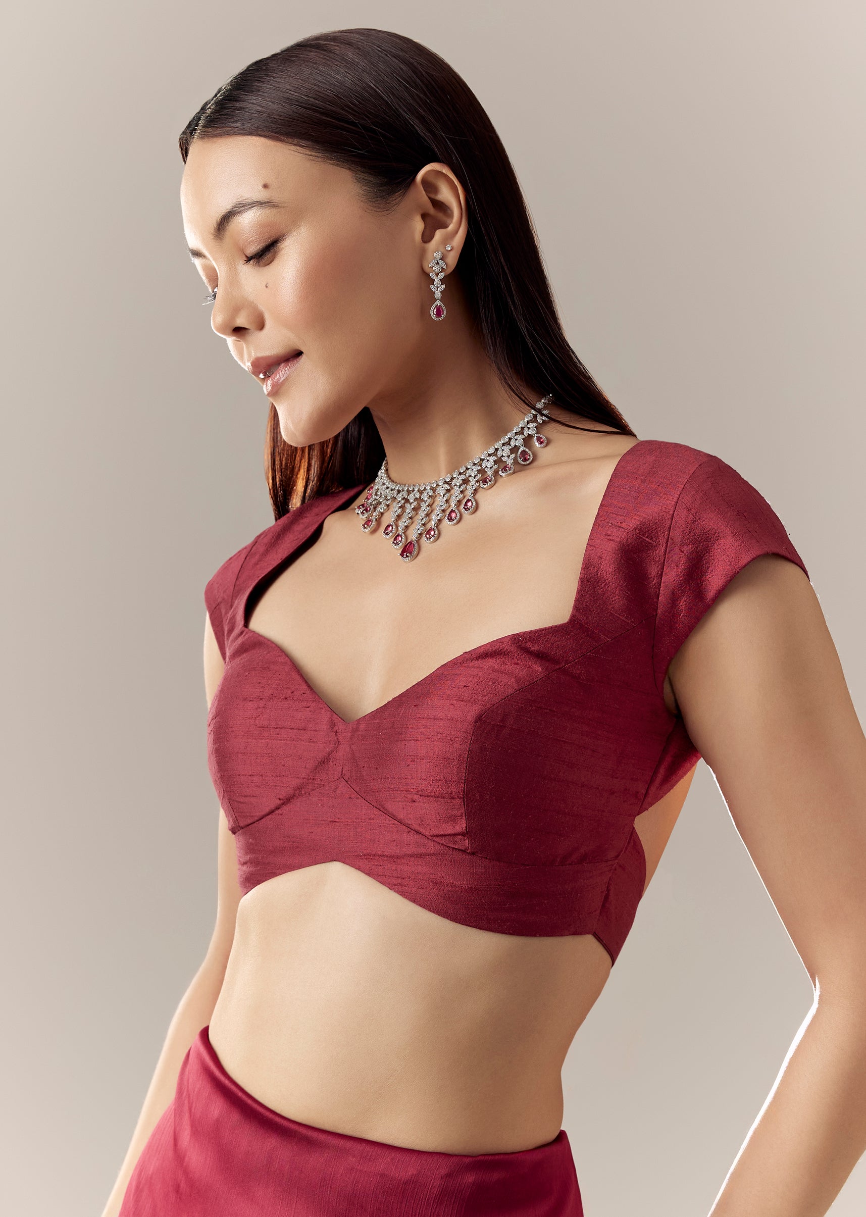 A maroon rawsilk blouse with a sweetheart neckline, cap sleeves, and elastic detailing at the back for comfort and a smooth fit. Awarded as the Most Trusted Brand, we're delivering... More Product Details