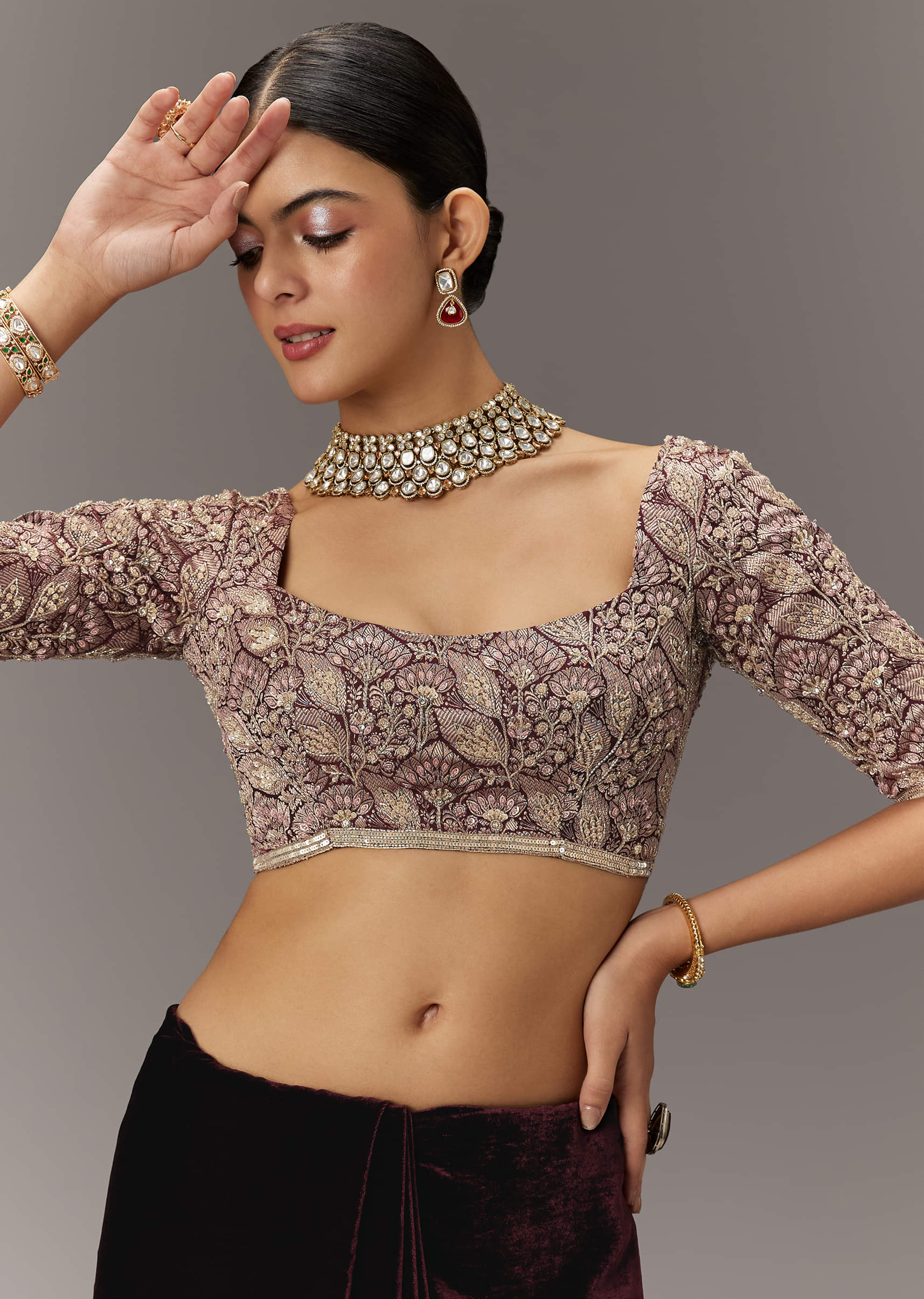 Maroon Velvet Saree With Brocade Embroidered Blouse