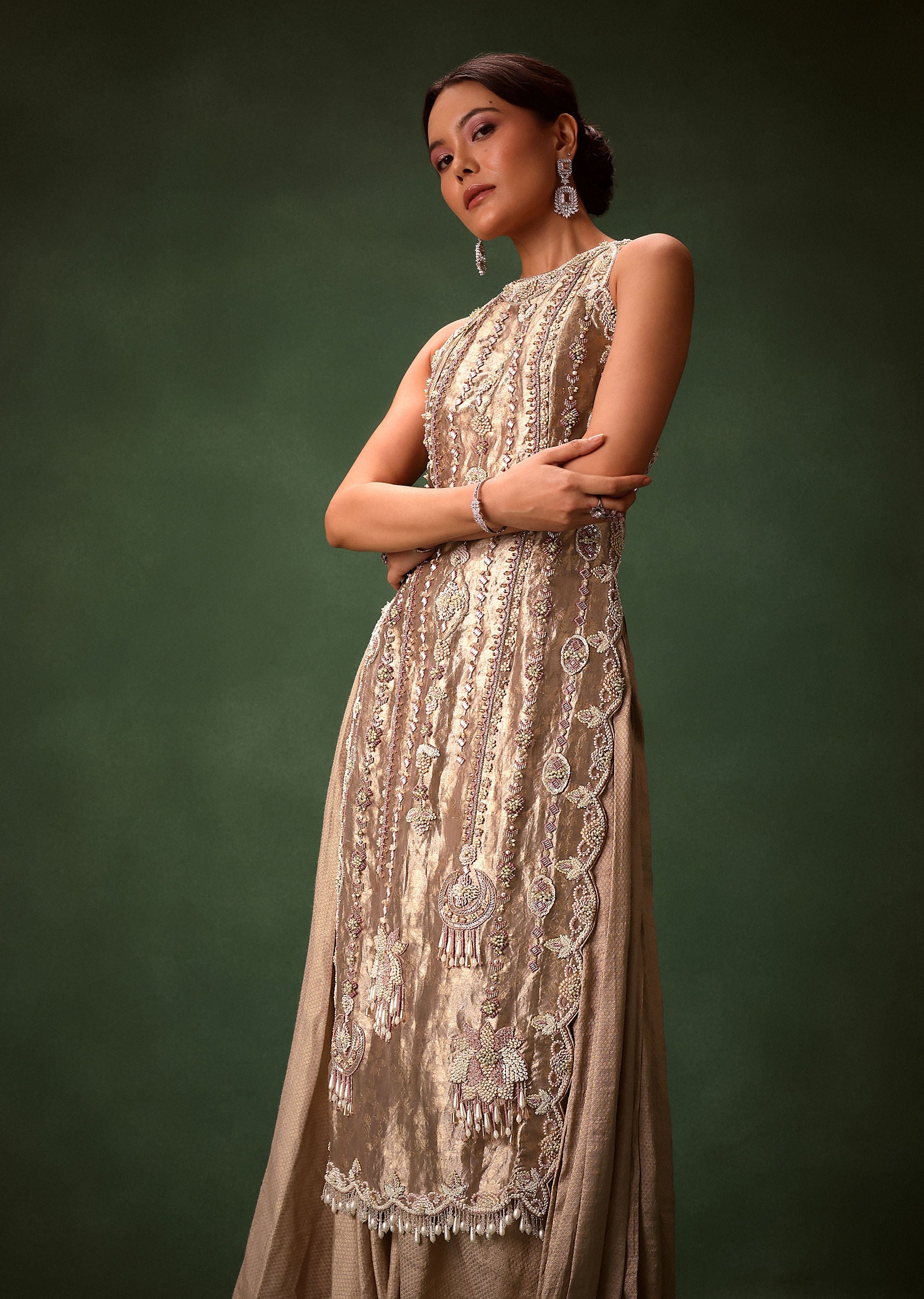 - The kurta showcases intricate geometric and floral motifs crafted with a self and white color combination using luxurious materials like katdana beads crystals and pearls adding a touch of opulence.