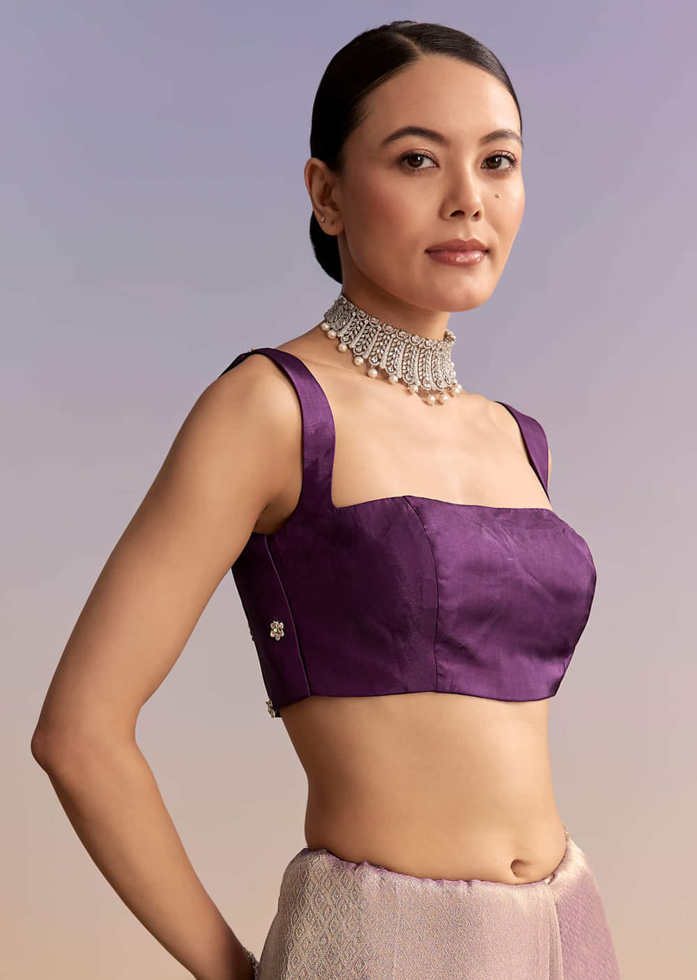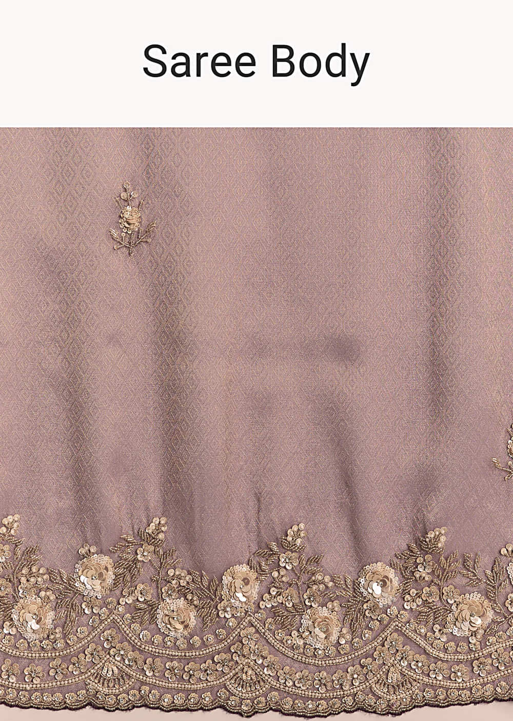 Evening lights suit this mauve jacquard embroidered saree that feels rich and camera-ready. A heavy floral scallop border and buttis in cutdana, sequins, and beads meet an embroidered contrast blouse.... More Product Details