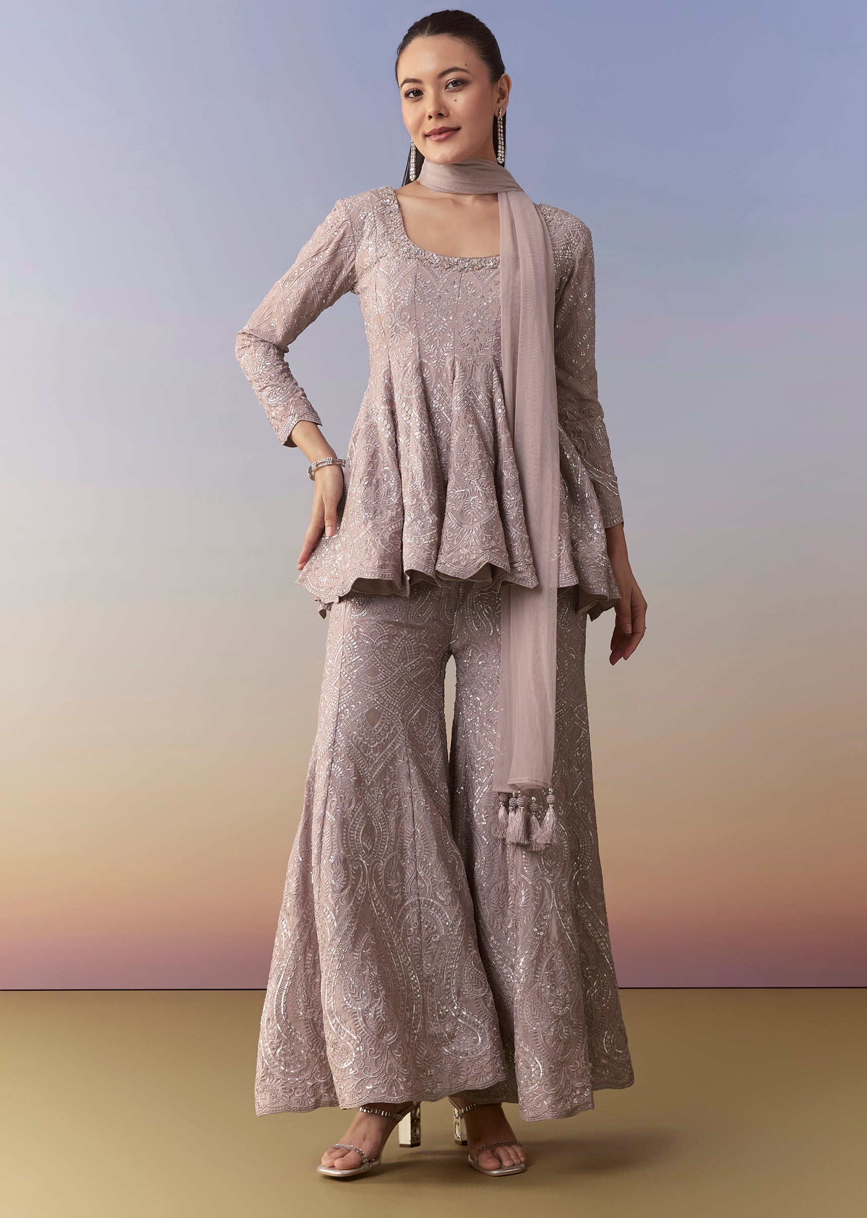 Embrace refined elegance with this mauve peplum-style kurta set, beautifully adorned with sequins and resham work that adds a subtle festive shimmer. The kalidaar palazzo enhances the silhouette with graceful... More Product Details