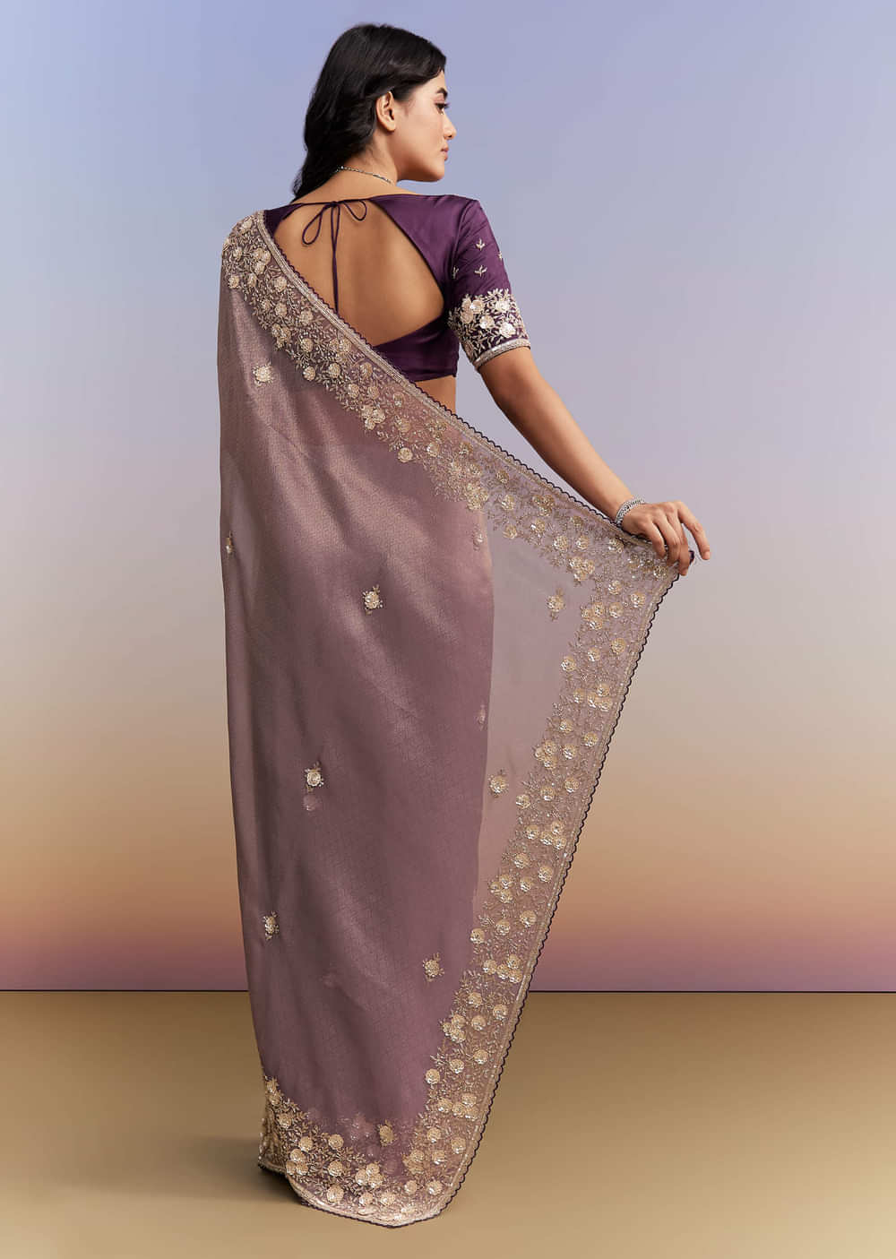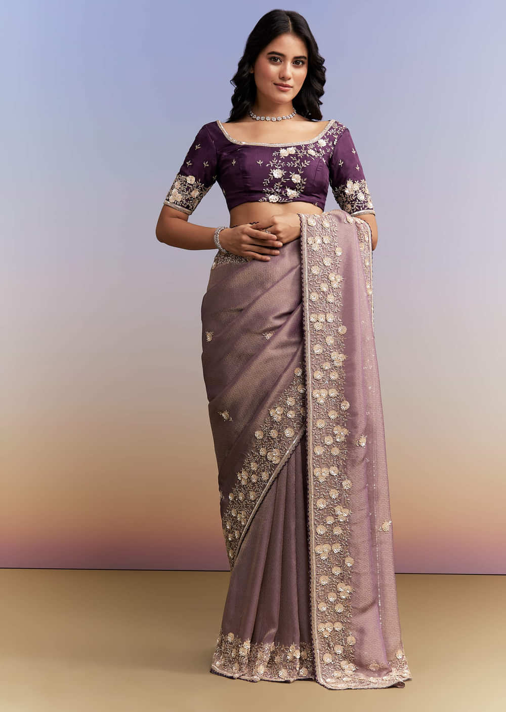 For a soft yet statement palette, this mauve purple jacquard tissue saree brings depth with contrast finishing. A heavy, floral embroidered contrast cut-work border frames buttis across the body in cutdana, sequins, beads and stones, with an embroidered contrast blouse fabric. You feel elegant and celebration-ready as the bride’s mother for sangeet, mehendi and reception functions. Awarded as the Most Trusted Brand, we're delivering styles you love, just as promised.