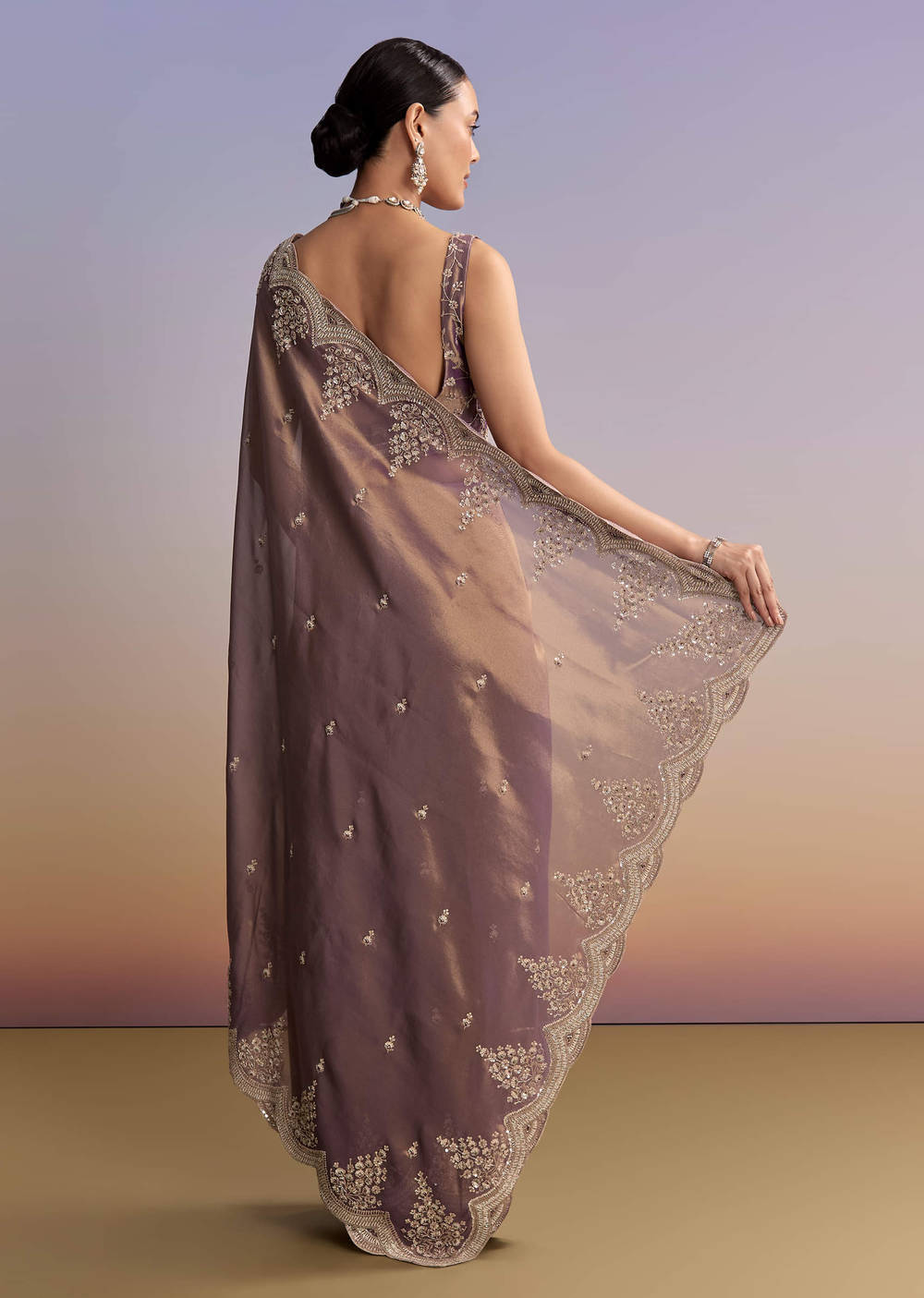 Mauve brings a mellow richness as this mauve tissue embroidered saree drapes elegantly. A heavy scallop border and tiny buttis are finished with cutdana, sequins, beads, and stones. It is a refined choice for a bride’s mother who wants a composed, camera-ready look. Awarded as the Most Trusted Brand, we're delivering styles you love, just as promised.