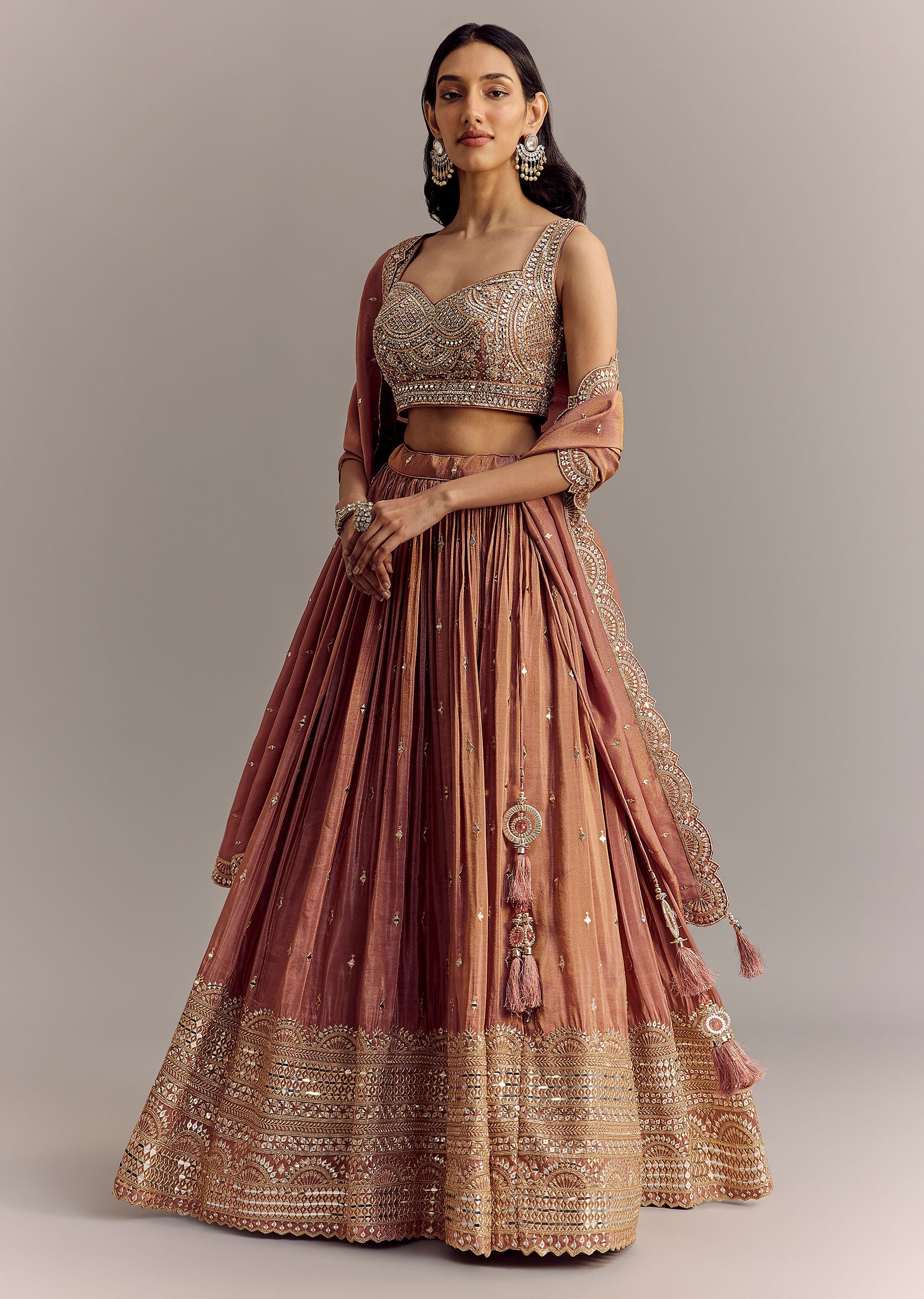Mauve Tissue Lehenga Set With Embroidered Choli And Dupatta