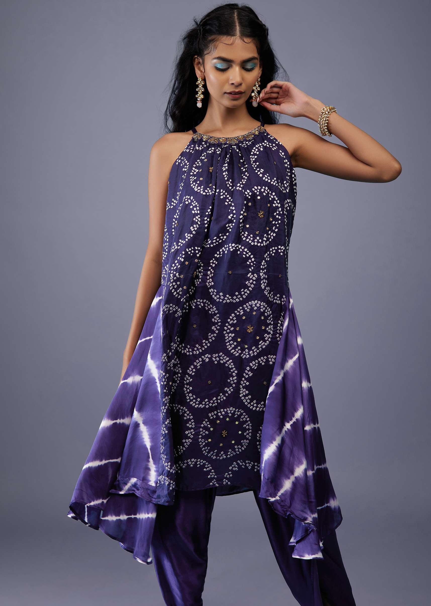Midnight Blue Silk Bandhani Top With Tie-Dye Side Panel And Silk Dhoti Pants