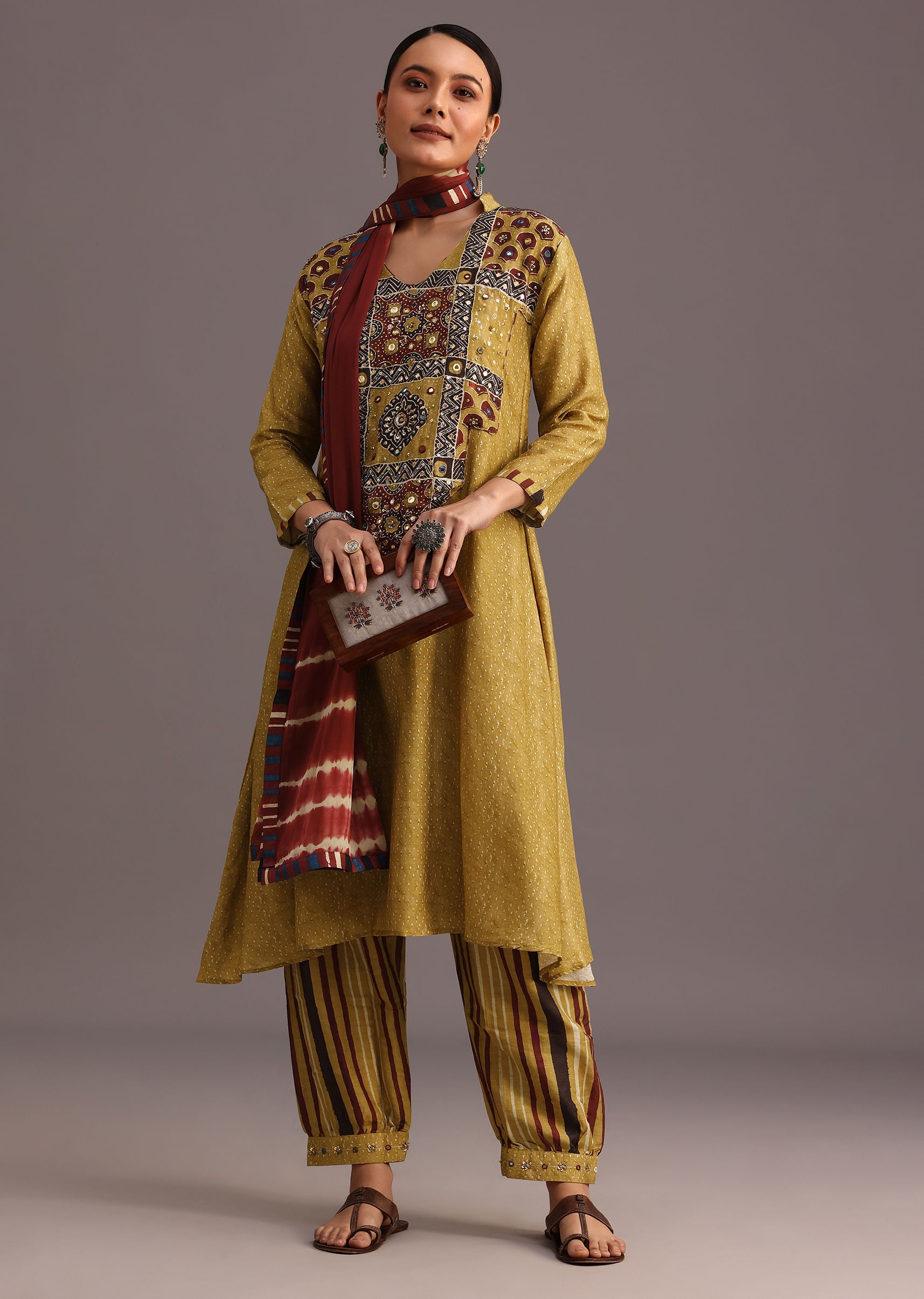 Mehendi Green Ajrakh Printed Kurti With Stripe Printed Salwar