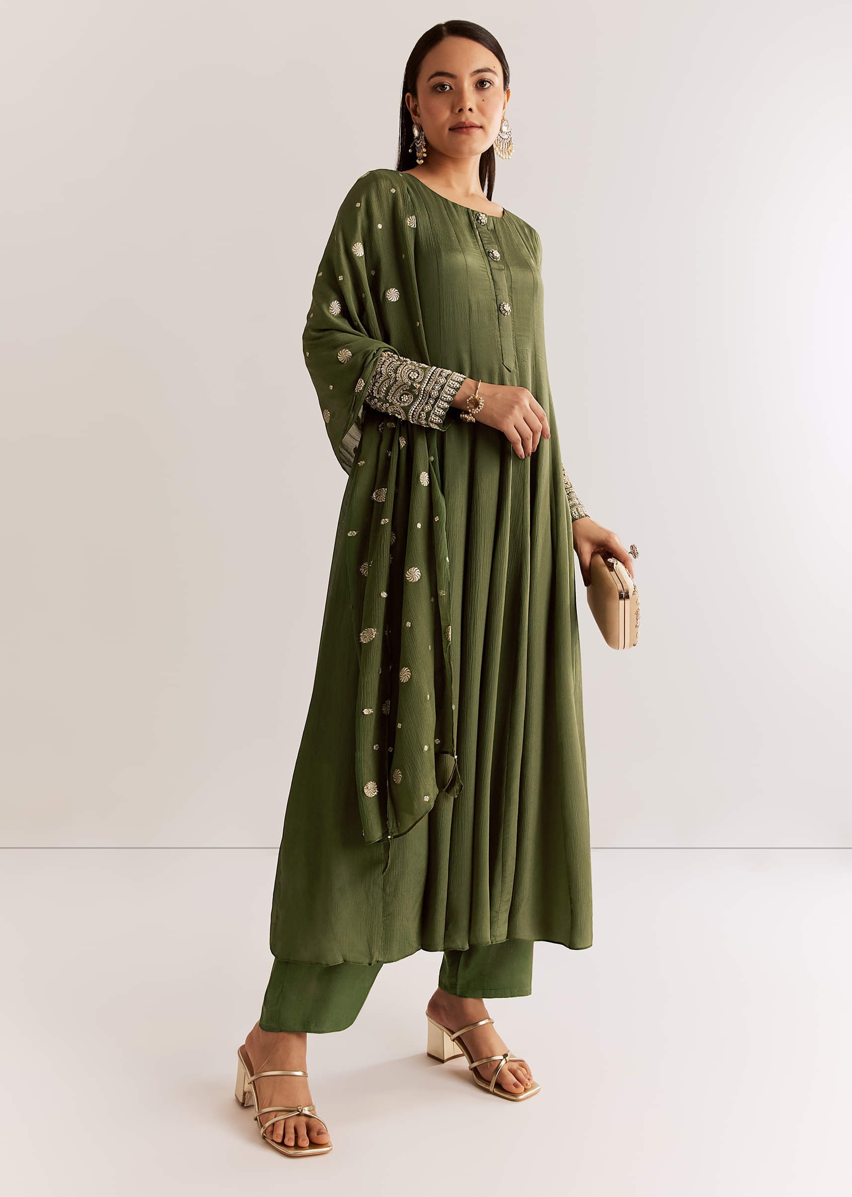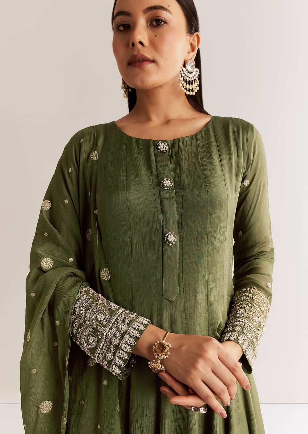 Mehendi Green Chinon Kurta Set With Zardosi And Butti Work